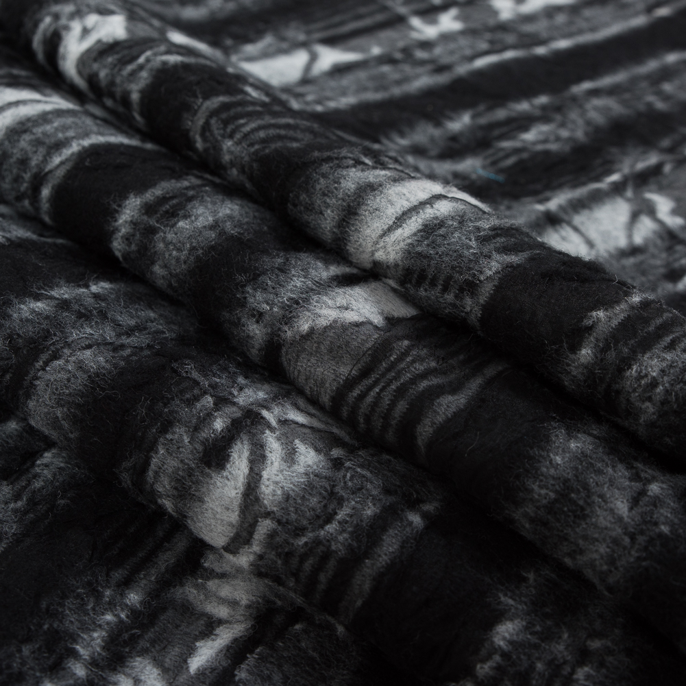 A fantastical and edgy piece, this Black Striped Wool Knit and Black Solid Organza Bonded with a Floral Design comes from the mind of Rick Owens. An organza is fused to a soft, fuzzy striped wool as a subtle floral design is created overtop. The thick knit present a voluminous drape that makes it ideal for A-line and boxy silhouettes. Thick with a heavy weight, create cocoon jackets and long coats for fall and winter. Opaque, a lining is optional.