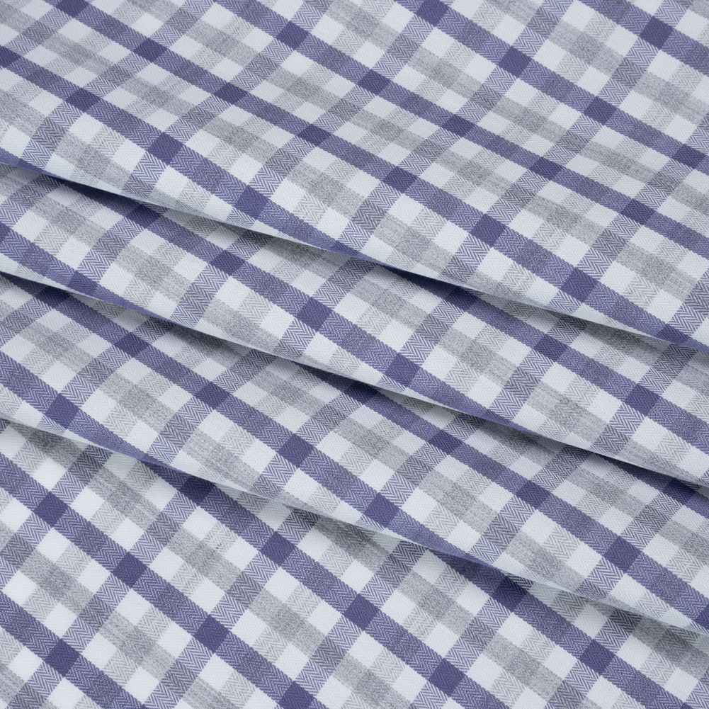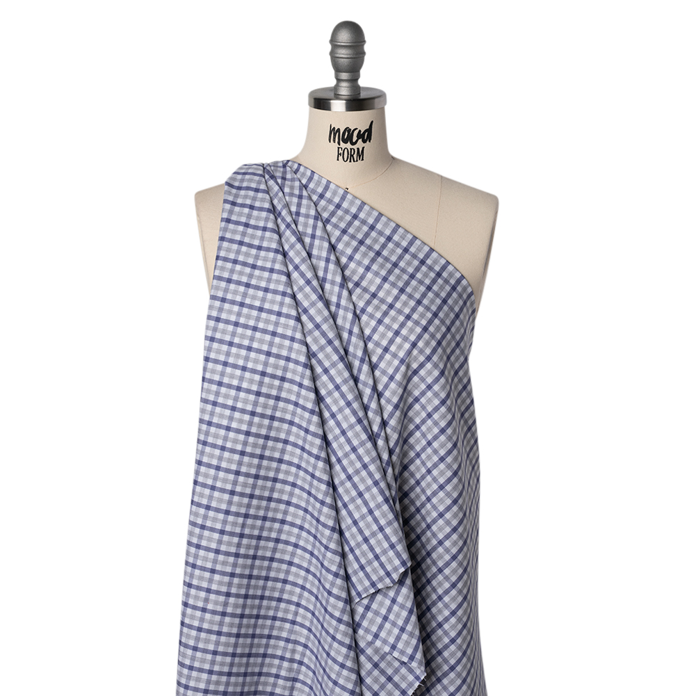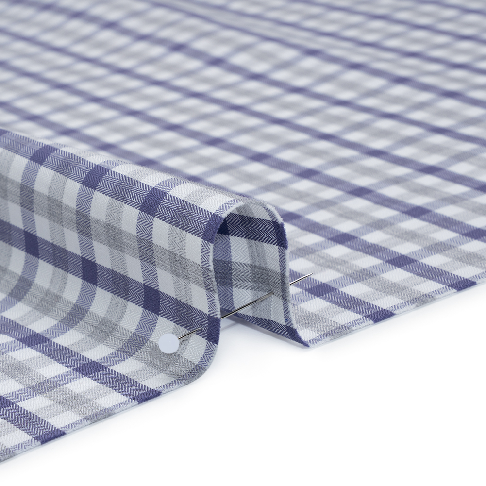 Tailored for timelessness, this Blue, Gray and White Tattersall Check Cotton Herringbone Twill Shirting balances precision with softness—featuring a smooth hand and fluid drape.Suggested Projects: Shirts, Skirts, Dresses, BlazersContent: CottonStretch: NoneOpacity: Mostly OpaqueBlue and gray stripes overlap across a crisp white backdrop in an intricate tattersall check design, woven into a refined herringbone twill shirting. Composed of cotton fibers, this shirting is breathable, soft, and cool in hand, with a twill weave adding durability and a fluid drape. Try preppy button-downs and blazers, or even flowing A-line skirts and button-up dresses. Though mostly opaque, a lining may be added to increase opacity and structure.