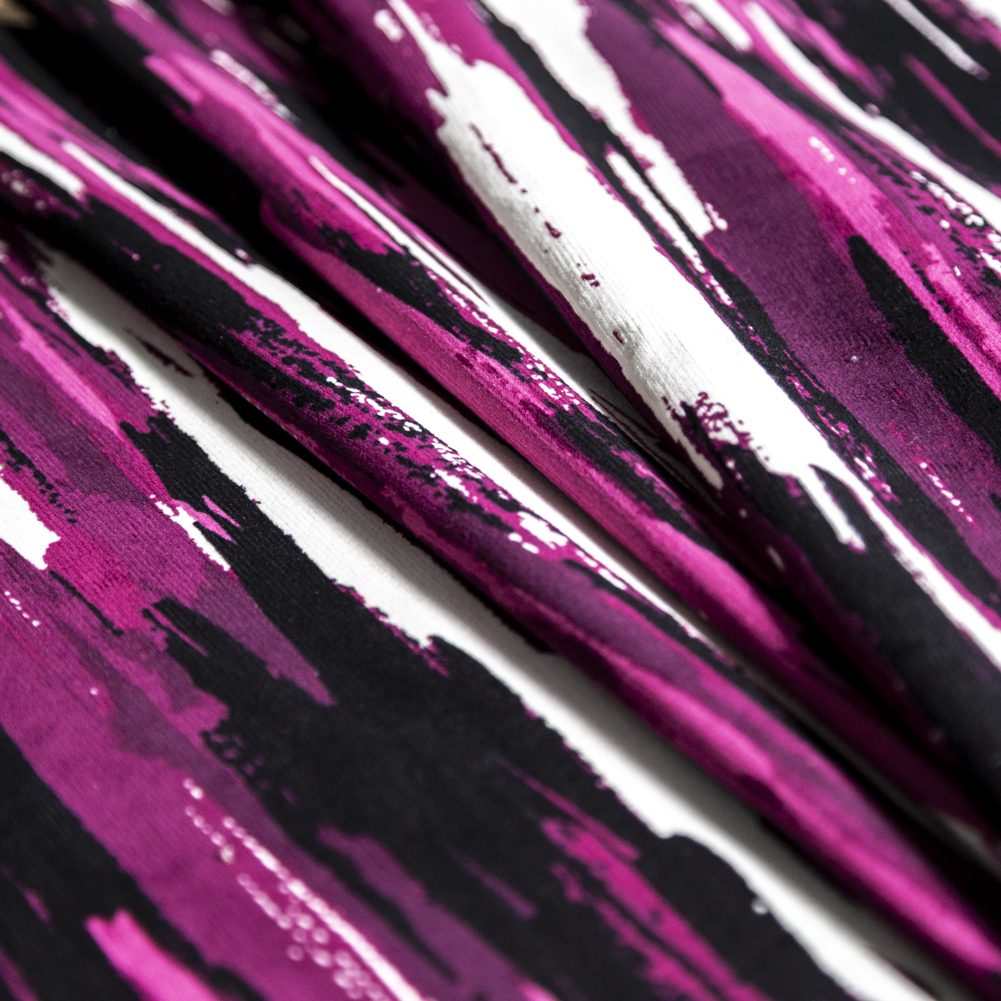 Daring and couture, our Purple Wine Abstract Stripes Stretch Cotton Corduroy would have made even Prince blush! Featuring camouflage-like, abstract stripes in an eclectic colorway, it cannot be denied that this stretch cotton corduroy has a magnetic charm.