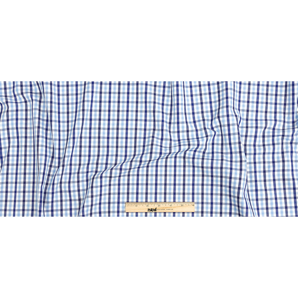 Keep your cool while sporting this Premium Sky Blue and Navy Medium Tattersall Checkered Cotton Shirting. Ultra smooth and slightly crisp in hand, its medium checkered design features a tripartite color combination that makes for a slight sheen throughout. Lightweight and without stretch, its single-ply construction boasts a thread count of 60-70, making it the ideal fabric for a number of different shirting applications. Fashion an assortment of button-up shirts to wear to work, or aim for a more luxurious silhouette and design fluttering shirt dresses with puffed sleeves that take advantage of its voluminous, malleable drape. Slightly translucent, a lining may be desired for true opacity depending on its application.