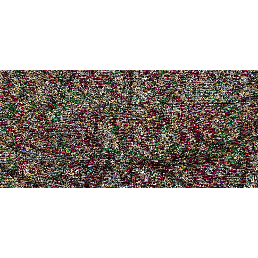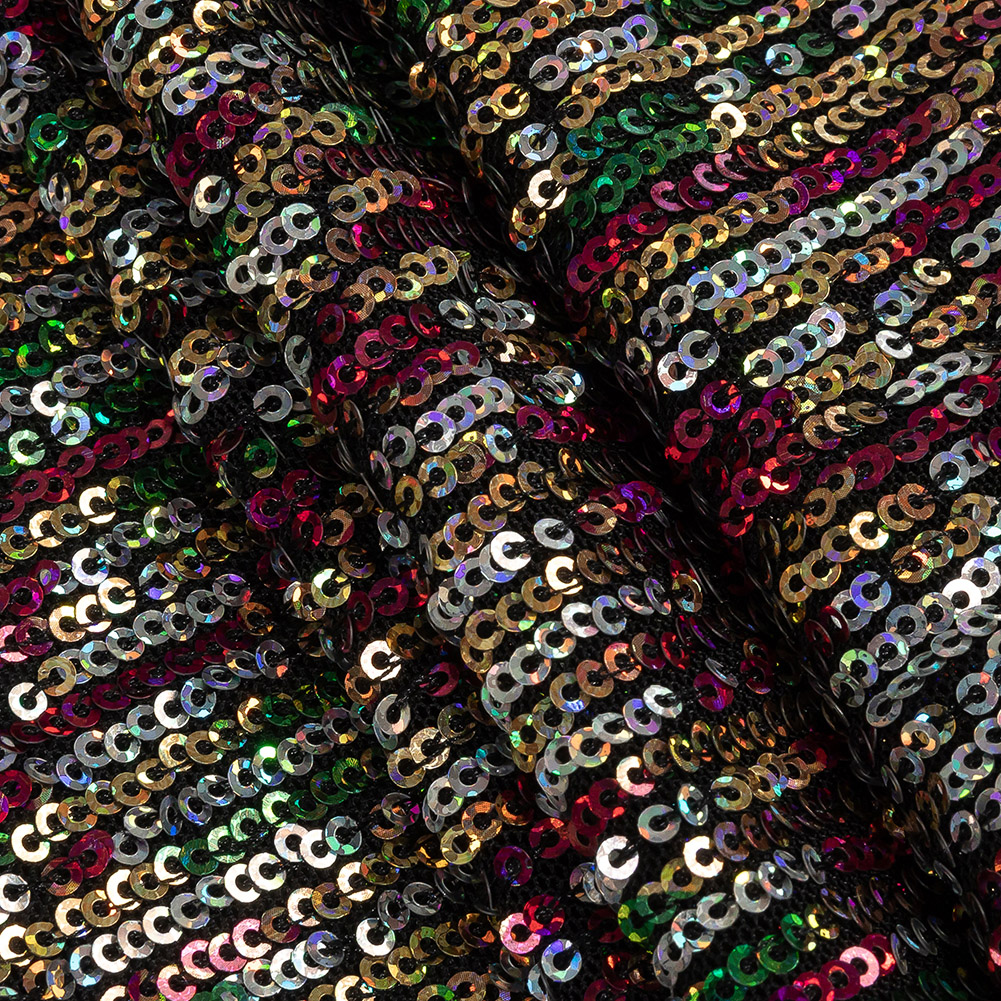 Show off your true colors in this Flavio Metallic Rainbow Stretch Sequins fabric! Lines of hot pink, grass green, gold, and silver baby sequins run across the weft of the black mesh material, stopping roughly 4 inches short of the selvages and leaving a band of plain mesh. The stitches attaching the sequins leave a ribbed-like texture on the reverse of the fabric and mean that the stretch is primarily one-way, along the warp. With a captivating sparkle and flexible drape, craft spotlight-worthy dance and skating costumes, elegant gowns, and dresses, along with accessories like headbands and bags! A lining will be necessary for opacity, comfort in wear, and additional structure in some garments.