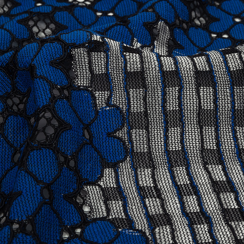Treat yourself like royal-ty with this Royal Blue and Silvery Floral Corded Lace Panel! Measuring 65” by 57”, this panel features vivid blue flowers and latticework surrounding intersecting bars of silver that are overlaid with larger black and silver flowers, all outlined in narrow black cord. The edges have a silver scalloped finish. With a silky hand made textural by the cording and a deliciously fluid drape, create elegant ball gowns and expressive capes, or add statement sleeves and gleaming overlays to dresses and blouses. With an open construction, a lining or underlayer may be necessary for modesty in some projects.