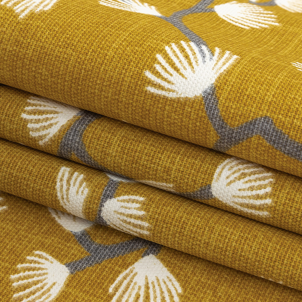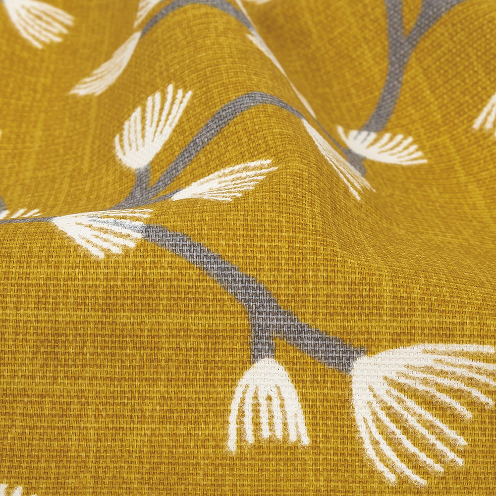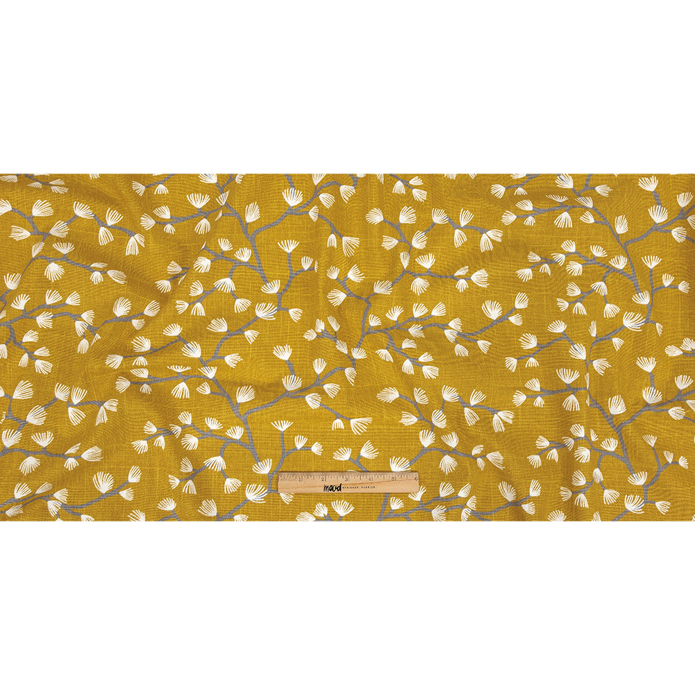 Turn toward the sun and welcome this British Imported Sunflower Japanese Blooms Printed Cotton Canvas into your life! Artistic renditions of white Japanese flowers blooming from purple-gray branches stretch across the ochre ground, which has slight variations in hue due to the subtle cross-hatched appearance. Crisp yet smooth in hand with a structural drape, transform this versatile cotton canvas into curtains, swags, and valances that will shine as the focal point of any room, or enhance your living space with patterned throw pillows and cushions! Slightly translucent, this lightweight fabric allows some light through, so consider adding a lining for complete opacity when creating drapery. Please note that because the print does not reach the selvages, only 55 inches of the total width are usable.