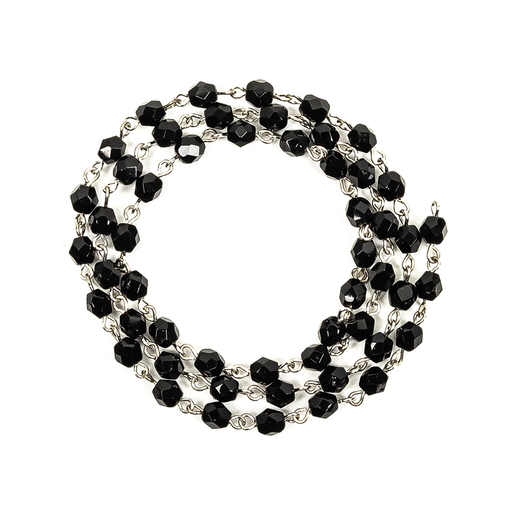 Don’t get chained to the same old boring trims when this Vintage Czech Jet Beads and Silver Metal Link Chain is right here! Jet black faceted beads are attached with bright silver metal links for a subtly shining chain of pure luxury, measuring 3/16 inches wide with a gauge of 4.
