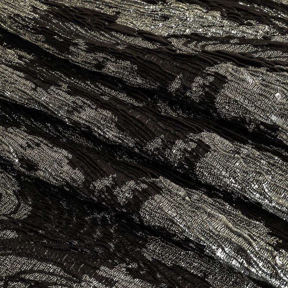 Go against the grain with our completely unique, yet undeniably opulent Metallic Silver and Black Wood Grain Luxury Plisse Brocade! Packed with texture, this plisse is permanently pressed to give the appearance of crinkles or puckers, effortlessly following the silver and black wood-grain pattern. Coarse in hand with a somewhat pliable, voluminous drape, try palazzo pants, ruched blouses, and evening gowns that cling to the body, giving the wearer a sumptuously sylvan appearance. Opaque, a lining may still be desired for comfortability purposes.Please note: Although this fabric may appear to have ample widthwise give, it should not be treated or sewn as a stretch fabric.Please be aware that this pleated fabric is measured and cut with the pleats closed and folded.