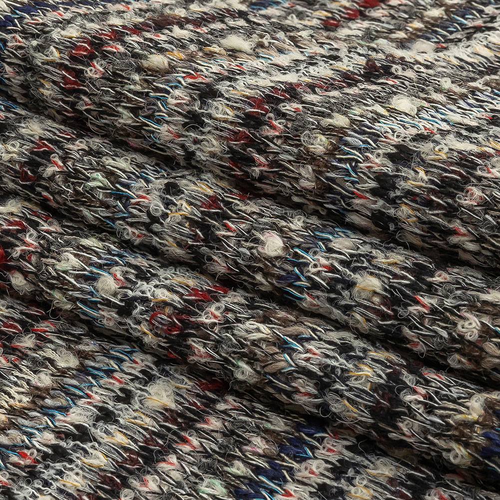 Who doesn’t tweed a few yards of this Caviar, Tofu, Red and Blue Tweedy Stripes Wool and Cotton Sweater Knit?! Mismatched stripes of gray and black form a tweed-like base, occasionally interrupted by white boucle loops and pops of red and blue fibers.