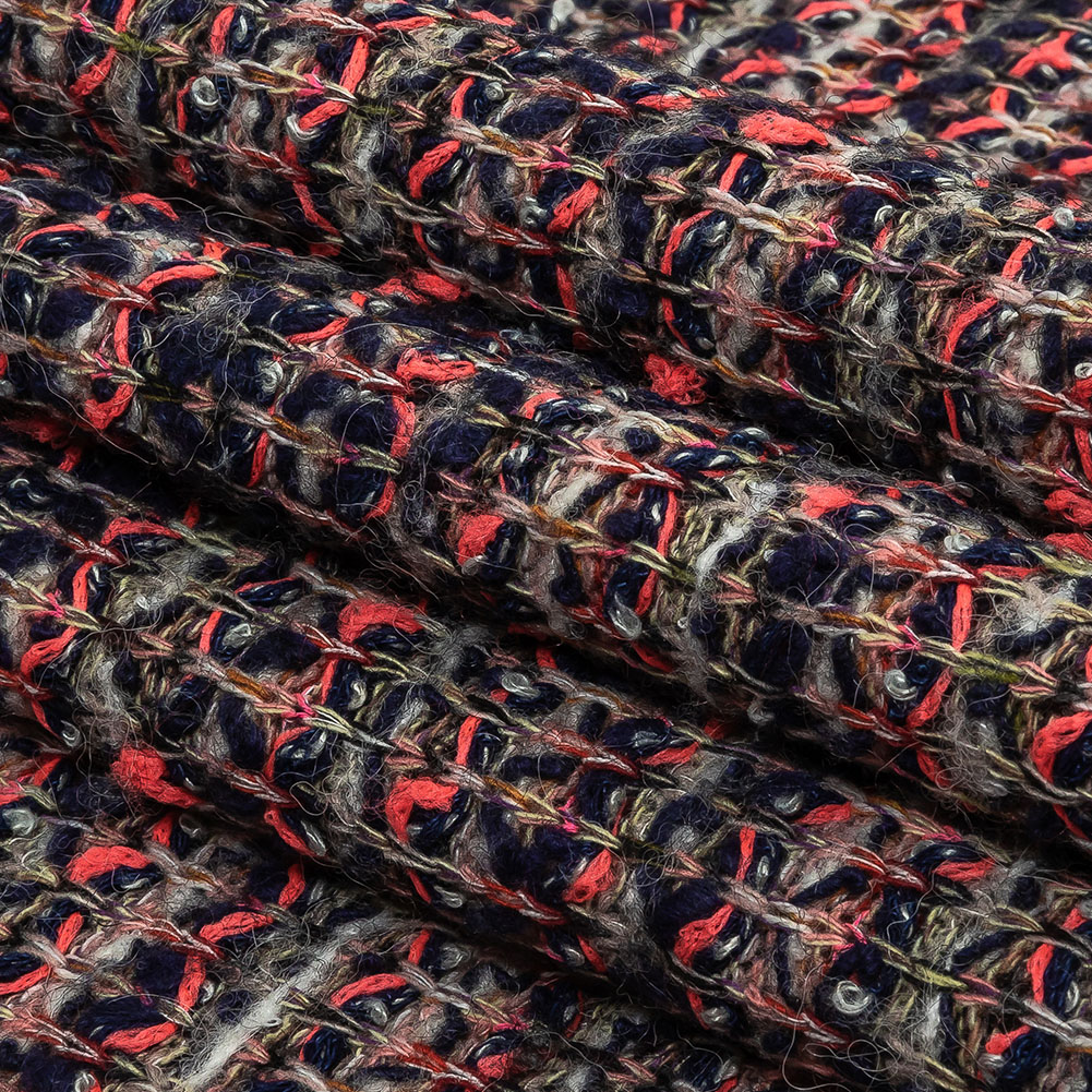 Looking to hop onto the neon trend? Try this trendy shade for yourself with this Italian Navy, Beige and Neon Pink Striped Boucle Blended Wool Sweater Knit! Bright streaks of neon pink run across the face, knitted with navy blue, beige, and gray yarns for a totally fuzzy fabric. Malleable and bouncy in drape with a 25% widthwise stretch, electrify your wardrobe with Y2K-inspired sweater sets, cardigans, and pullovers. Somewhat translucent, a lining is not necessary for most garments.