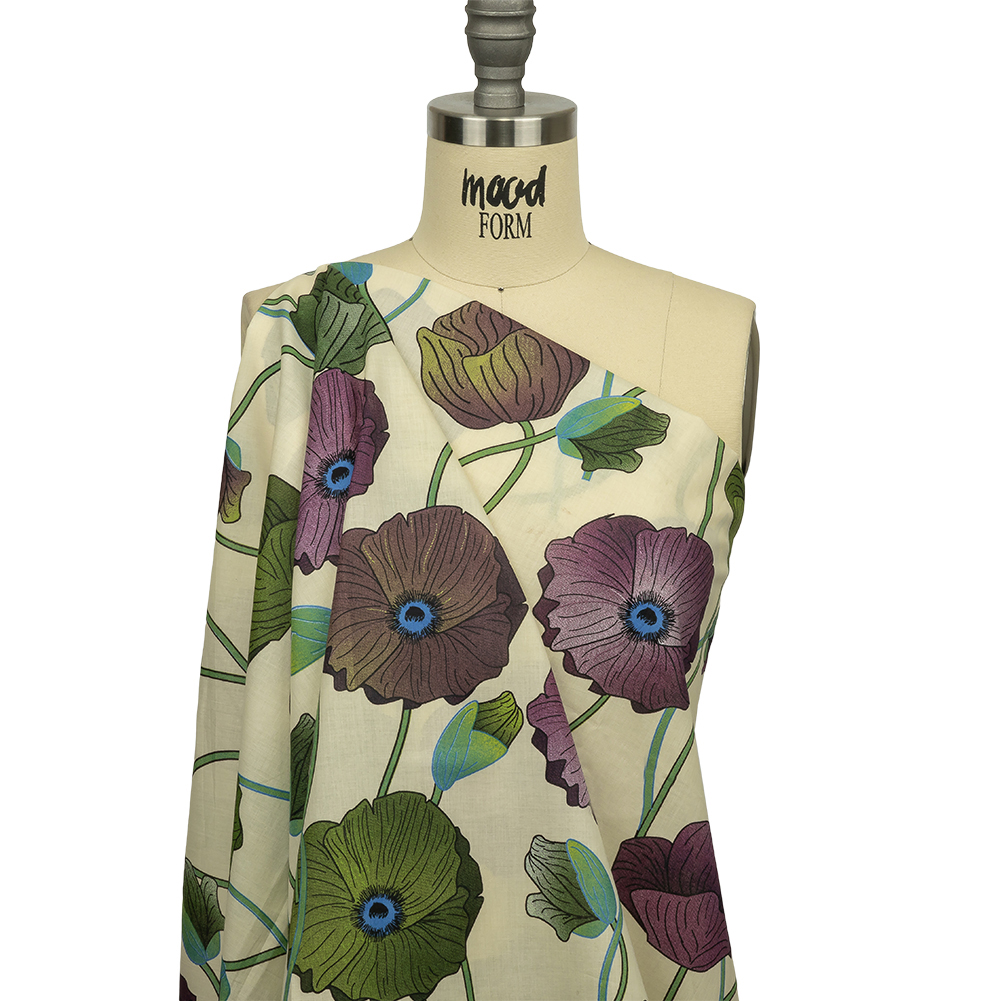 Share your love of plants with others sporting this Beige, Green and Plum Big Poppies Cotton Lawn.