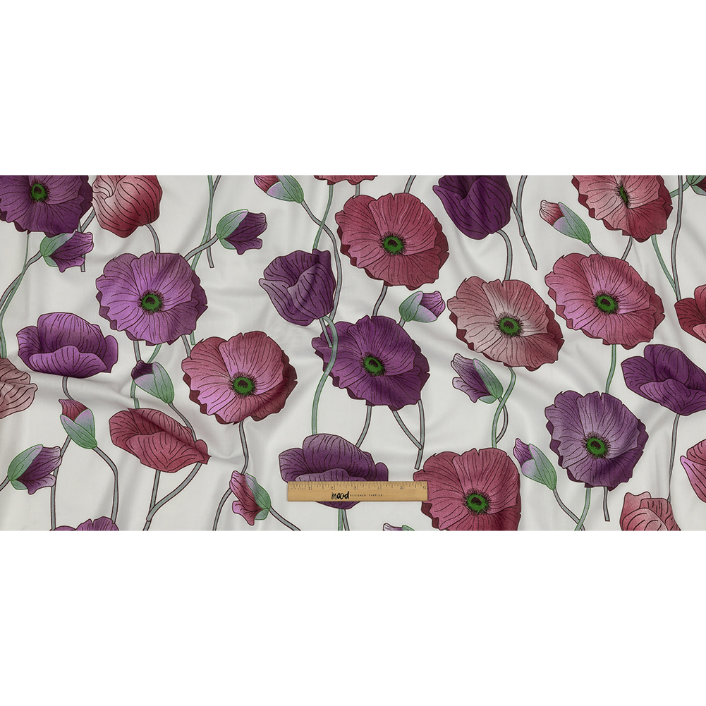 Emanate positive vibes with this Magenta, Purple and Gray Green Big Poppies Cotton Lawn! Composed of vivid magenta, deep purple, and begonia pink blossoms with green-gray stems, these two-dimensional flowers flourish over a white background. Breathable and billowy in drape, dabble with button-down shirts, ethereal flared pants, nightdresses or PJ sets, and beach coverups. This lightweight material is translucent, so we suggest the addition of a lining when a raised opacity is desired.