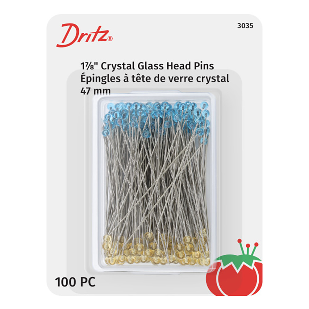 Pin your projects in place with these Dritz Crystal Glass Head Pins. Each pack includes 100 pins—1⅞” long with heat-resistant blue and yellow crystal glass heads for comfortable handling—neatly stored in a reusable plastic box. Ideal for basting quilt layers or working with multiple layers of fabric, they keep materials securely in place, ensuring your creative process stays smooth and uninterrupted.