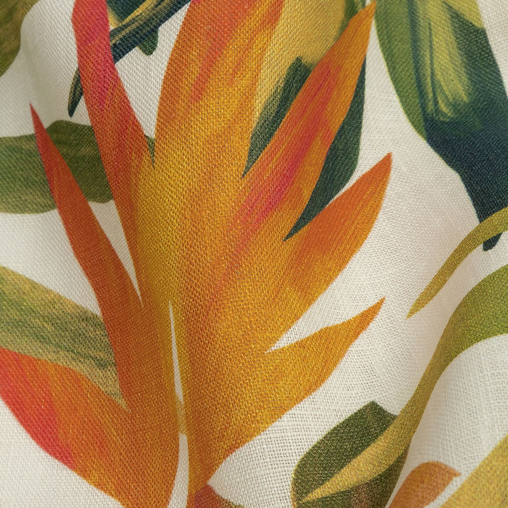 Be transported somewhere warm with this Orange, Pink, and Green Zesty Tropics Medium Weight Linen Woven! Pink, green, and orange leaves create a tropical masterpiece over a white ground. With a soft, slightly crisp texture and flexible drape, design dresses, aprons, bags, button-down shirts, skirts, pillowcases, tablecloths, shorts, runners, crop tops, bandeau tops and so much more. This material has no stretch and is opaque, so a lining is entirely optional.