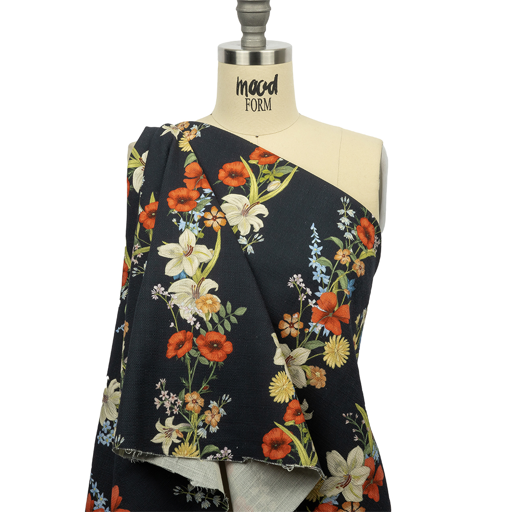Take a walk through a manicured garden with this Mood Exclusive Navy Wildflower Fields Stretch Cotton Woven. Elegant ropes of flowers run in lengthwise stripes across a white base, like garlands for a spring celebration. With a crisp, textural hand caused by the basketweave composition, this woven features a slight stretch through the weft. With a full, flexible drape, create vacation-worthy looks like shorts, cropped pants, button-up shirts, and tailored sundresses. While a lining is great for adding structure to some garments, this material is opaque enough to go lining-free.