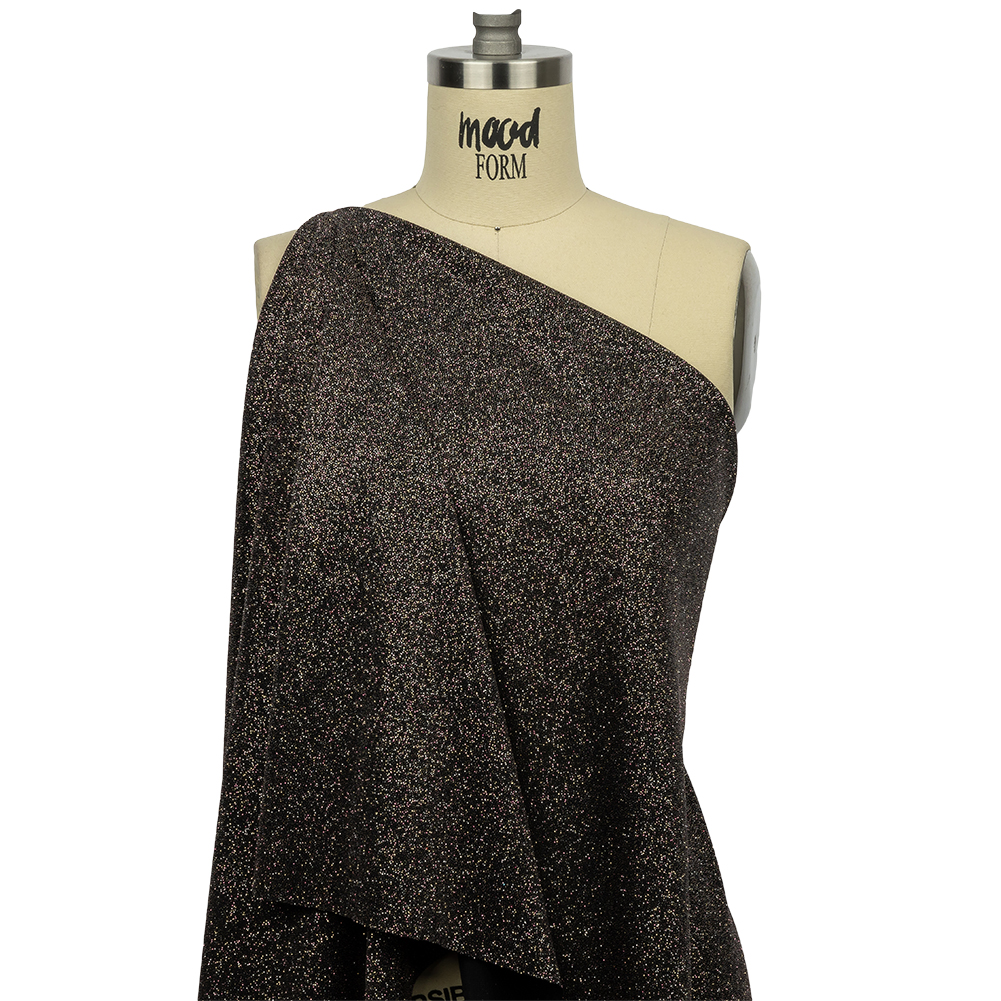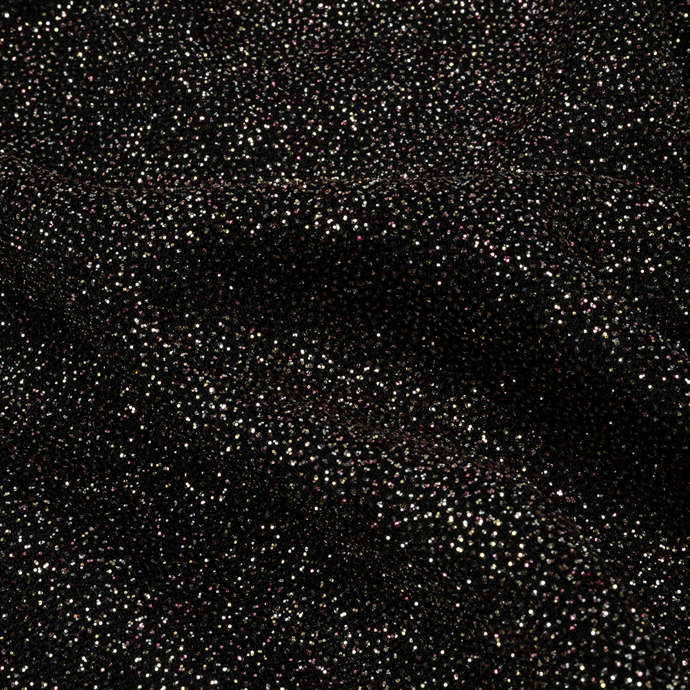 Dance with the stars with this Metallic Black All-Over Glitter Nylon Knit. A black knit is encrusted with metallic silver threads and a sprinkling of pink glitter for the perfect amount of sparkle. Slick and soft on the back with a crisp, grainy face, it features a 50% widthwise stretch and effortlessly fluid drape. From everyday glam to special occasion sparkle, this fabric makes an excellent choice for slip or A-line dresses, skirts (mini, maxi, and everything in between), statement leggings, or even glamorous evening gowns. Mostly opaque, a lining is not necessary for most projects.