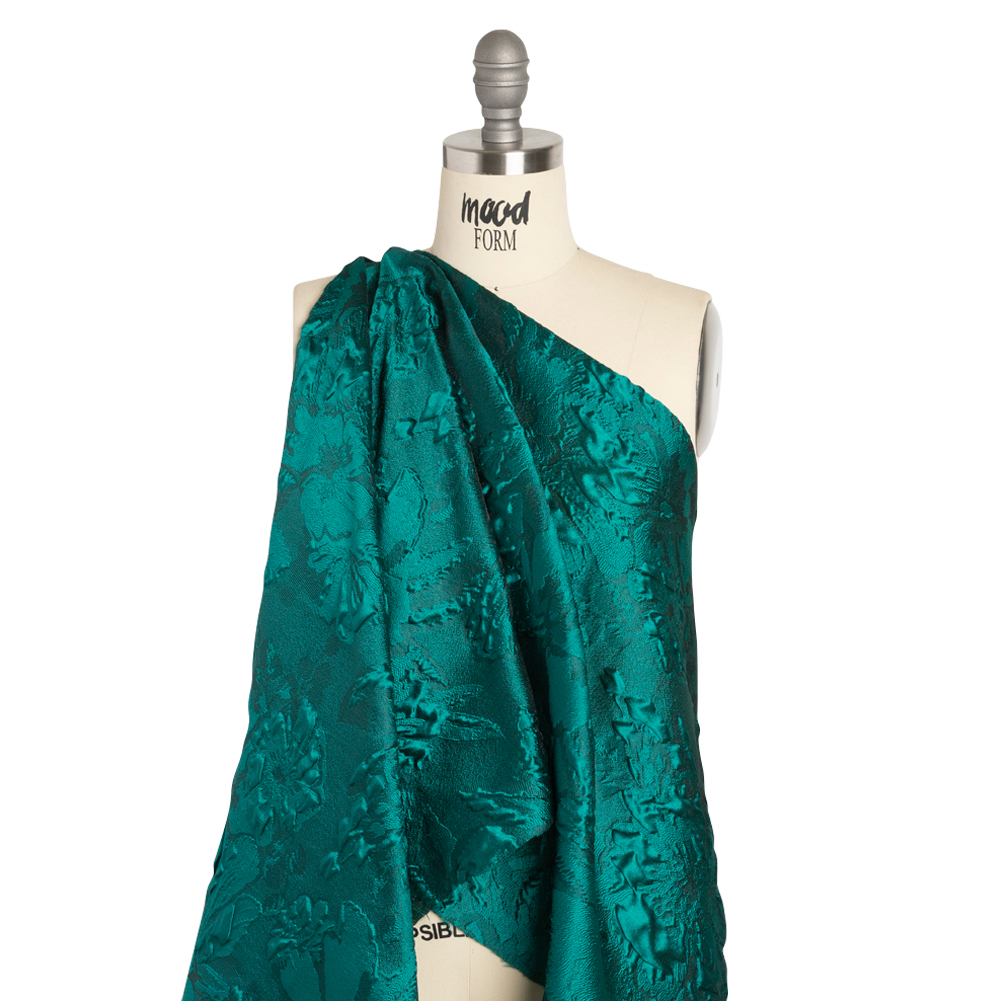 A richly saturated garden sprawls over this Luminous Teal Floral Lightweight Luxury Brocade. The complex weave of this brocade gives the teal flowers an embroidered-like look as well as raises petals from the surface. To deepen the dimension of the face, darker teal hides in the corners of the blossoms. The hand switches from sleek to grainy, and the drape is voluminous, inspiring luxurious formal garments of all styles and silhouettes. Invite this lustrous fabric to special occasions as a long gown, circle skirt, structured jacket, exciting corset, and more! As this fabric is highly transparent, a silk habotai lining is recommended to increase opacity and luxury!