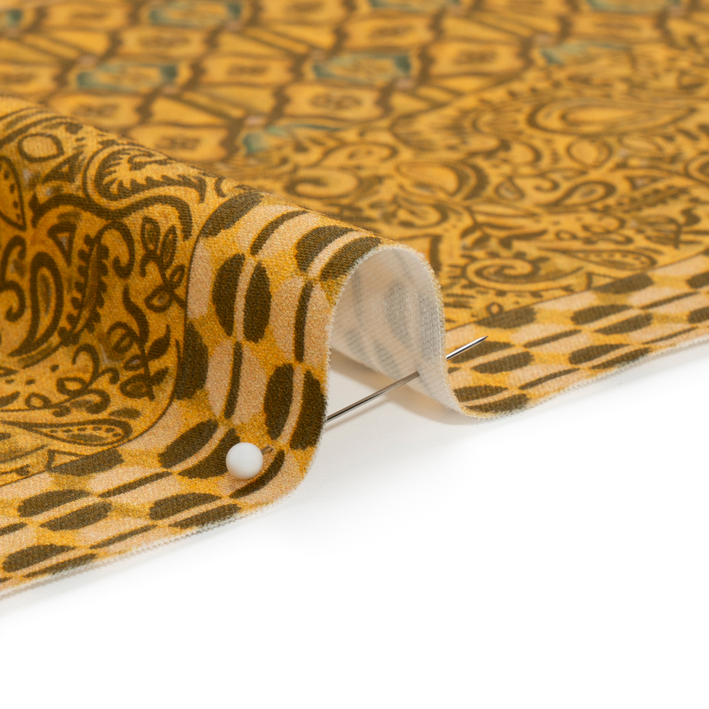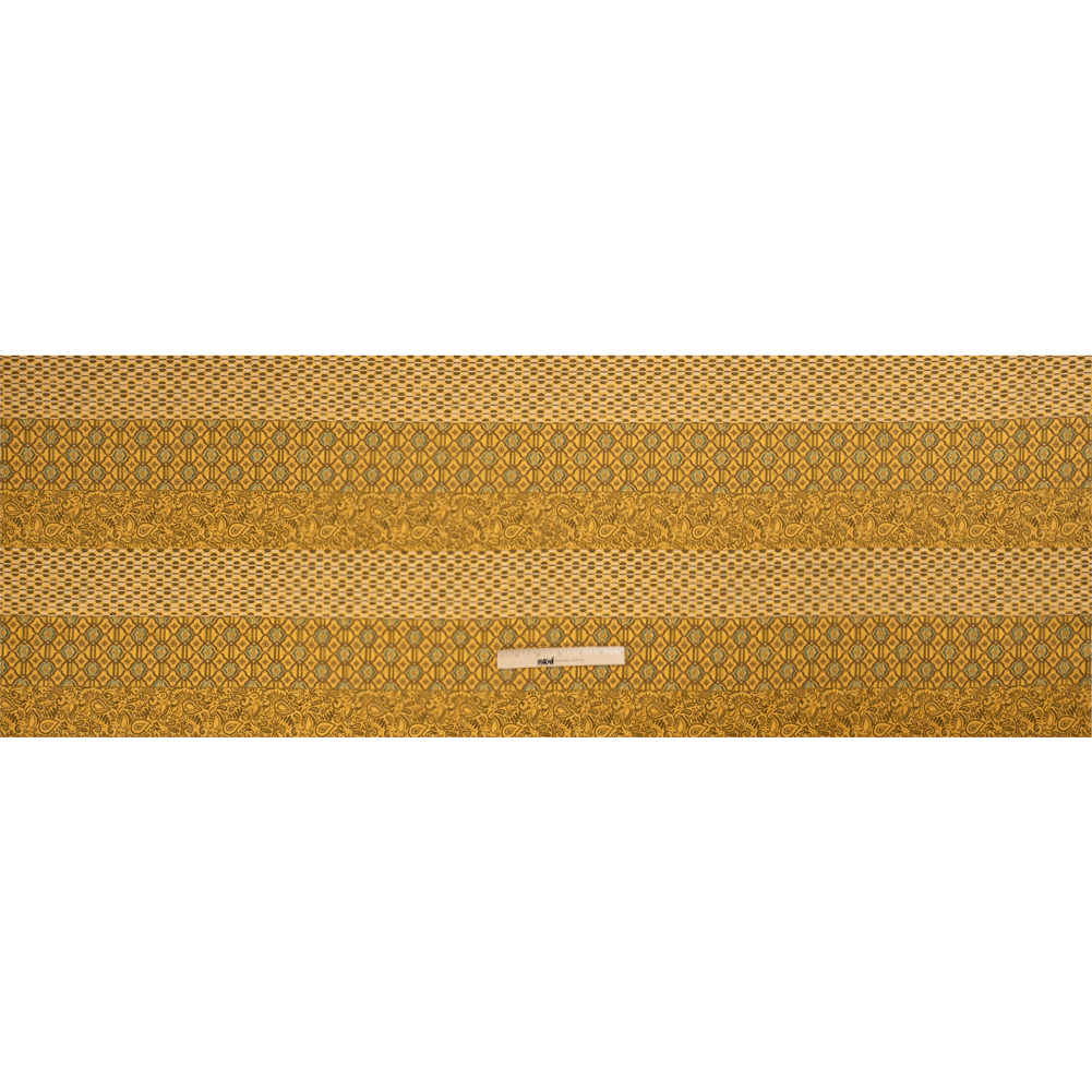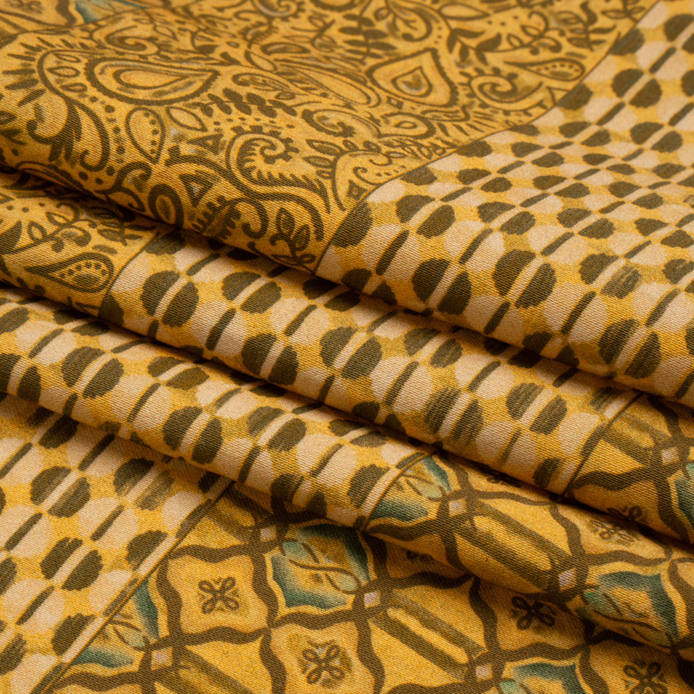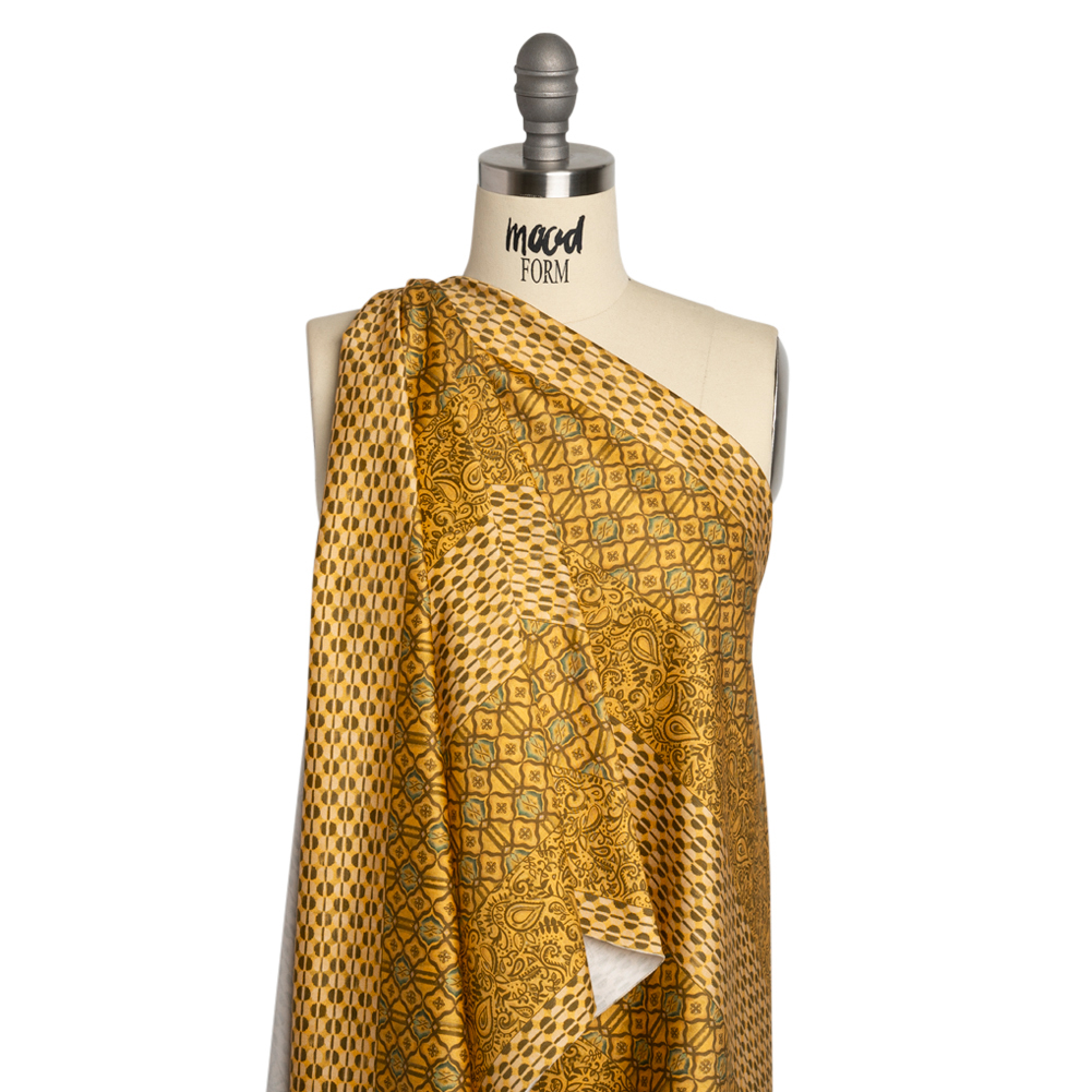 Our Mood Exclusive Yellow Tropic Arrangement Stretch Cotton Sateen is fun and sun-drenched, like an evening in the tropics. Busy patterns become idle in neatly organized rows, displaying hues of brown, mustard yellow, black, and turquoise. The dry hand, semi-structured drape, and slight shine will lead to durable all-weather sewing projects (that will promote comfortable movement thanks to the 15% weft-wise stretch, as well!). Have fun with stand-out cigarette pants, pencil skirts, or button-downs! Semi-translucent, a lining can be added if additional structure or modesty is desired.