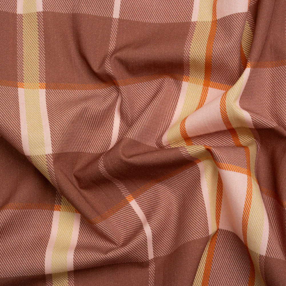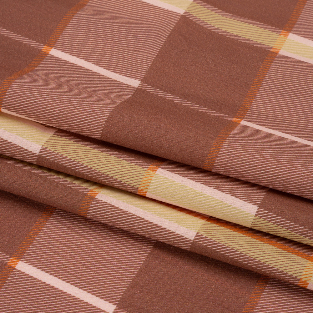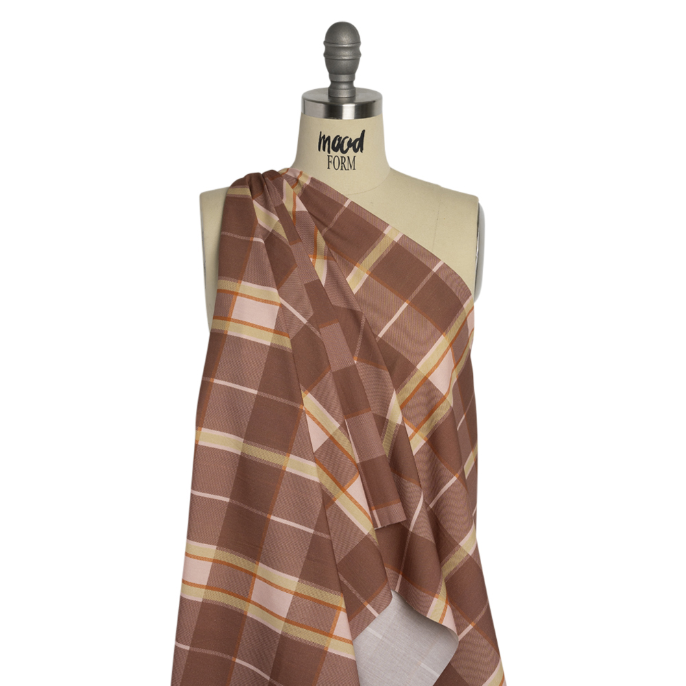 You take the high road and our Mood Exclusive Rust Loch Lomond Cotton Poplin will take the low road. Mauve and light pink checkers are the focal point of the face, accented with beige and orange stripes to form a plaid pattern. Thanks to the 100% cotton content, the hand is dry and the drape is crisp. Light in weight and cool against the skin, this fabric is excellent for shirting; boxy cropped tops, button-ups, and shirt dresses are just the beginning of what you can create!With its roots in Scottish heritage, plaid’s versatility, warmth, and tradition transcends time periods and cultures; from cool-weather wardrobes to grunge style to haute couture and more, this distinct pattern remains a timeless staple in any closet. As it is semi-translucent, a lining may be desired.