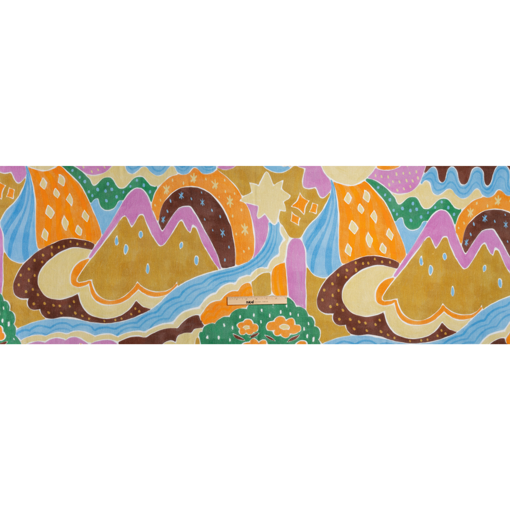 Visible only to those with their heads in the clouds, our Mood Exclusive Brown Moonbeam Mountain Slubbed Gauzy Cotton Woven paints a pastoral fantasy in earthy hues and berry tones. Magenta-frosted mountains bridge earth to sky, creating a playful dreamscape where moonbeams and comet tails live among the farmland. Easy-going energy is emitted from the gauzy hand and slubbed face, sitting cool against your skin even in the warmest of climates. Enhanced by a lightweight drape, this semi-sheer fabric brings a casual and ethereal feel to wrap blouses, maxi skirts, sundresses with ruffled sleeves, and more! A lining may be desired.