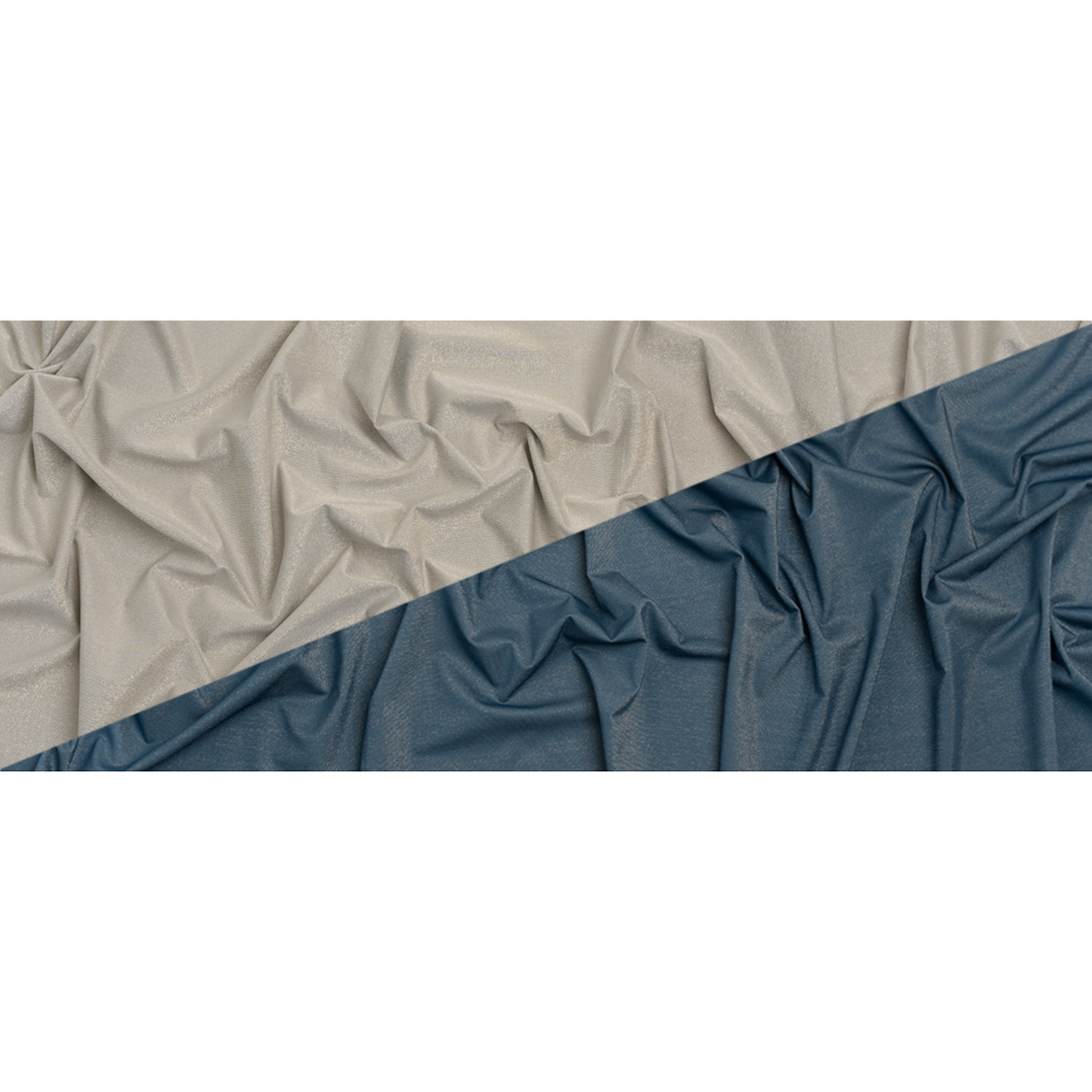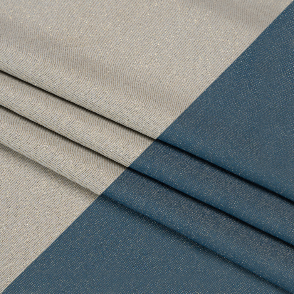 Get the best of both worlds with this luxe Famous Australian Designer Gray, French Blue and Metallic Gold Double Face Stretch Polyester Tricot. Metallic gold threading textures the sleek surface with a slightly grainy feel, instantly glamorizing the comfort of the 60% all-way stretch and fluid drape with an intoxicating brilliance. The French blue face and pale gray reverse push you to explore dual-toned creations and reversible garments with the promise of creating bodycon dresses, flared leggings, and biker shorts that are uniquely you.