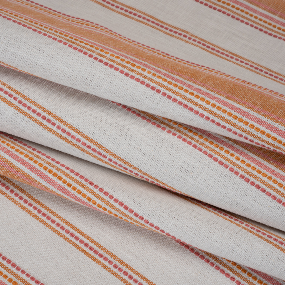 After picking oranges fresh from the tree in your backyard, sit and enjoy the breeze flowing in through this Tangerine Striped Cotton and Recycled Polyester Woven. With a tactile hand and crisp drape, it’s the perfect choice to make your house feel like a home.Suggested Projects: Curtains, Tablecloths, Reusable Napkins, Tote BagsContent: 58% Cotton, 42% Recycled PolyesterStretch: NoneOpacity: Slightly TranslucentTangerine and pink stripes race across a beige background—creating a feast for the eyes and the hand. The striped face and tactile hand orchestrate a laid-back, rustic feel, encouraging you to relax, open your windows, and let the breeze dance through your den, bedroom, or kitchen. The crisp drape easily maneuvers the nooks and crannies of all upholstery, while bringing life to your window treatments as well. As it is semi-translucent, a lining may be desired for sun protection and complete opacity.