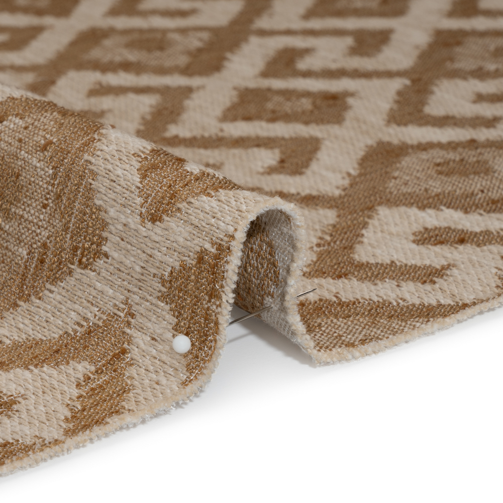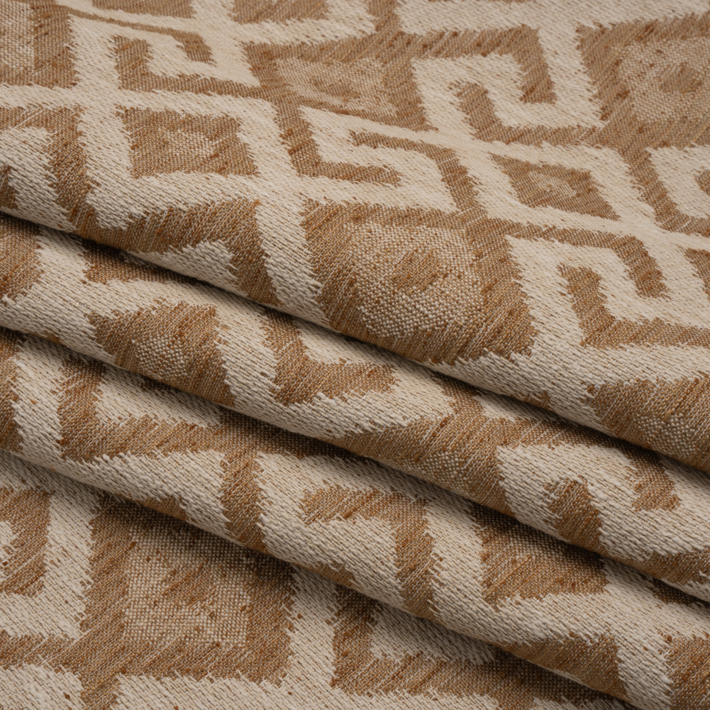 Take a crack at this Chestnut Greek Key Diamonds Upholstery Jacquard. With a tactile hand and malleable drape, it’s the key to your next interior design.Suggested Projects: Armchairs, Couches, Ottomans, HeadboardsContent: 86% Polyester, 14% CottonStretch: NoneOpacity: Mostly OpaqueA striking beige Greek-key diamond motif dances across this chestnut brown jacquard, echoing the timeless artistry of Greek pottery, architecture, and textiles—a tribute to the twisting, winding rivers of antiquity. With a tactile, slubbed hand and malleable drape, it’s perfect for upholstering armchairs, couches, ottomans, headboards, and beyond! Mostly opaque, a lining is not necessary for most applications. Please note: Due to the nature of the design, about 52” of the 54” width is usable.