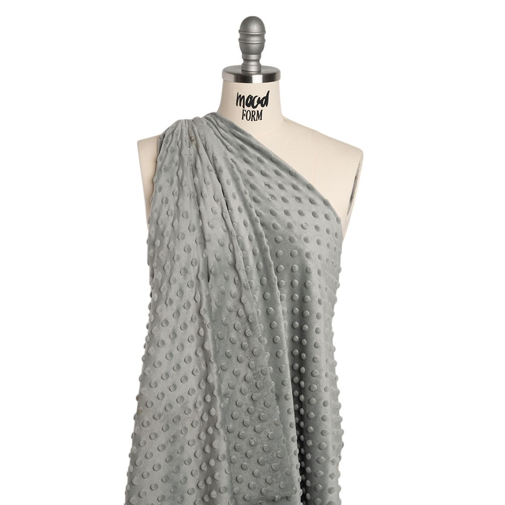 As luxurious as it is comfortable, this Silver Textured Polka Dots Minky is ready to grace your presence—featuring an ultra-soft hand and fluid drape.Suggested Projects: Robes, Pants, Dresses, ShirtsContent: 100% PolyesterStretch: 25% WeftwiseOpacity: OpaqueYour day-off daydreams begin with the irresistibly soft touch of this silver minky fabric, its raised polka dot design adding a playful charm to relaxed, casual garments. With a hand as plush as fleece and a luster akin to velvet, this dreamy fabric boasts a fluid drape and 25% stretch through the weft—perfect for wrapping yourself in comfort. This stretchy minky fabric is ideal for luxurious loungewear pieces such as wide-leg pajama pants, oversized robes, and button-up pajama tops that you’ll want to lay the day away in. Opaque, this fabric needs no lining—just pure, indulgent relaxation.