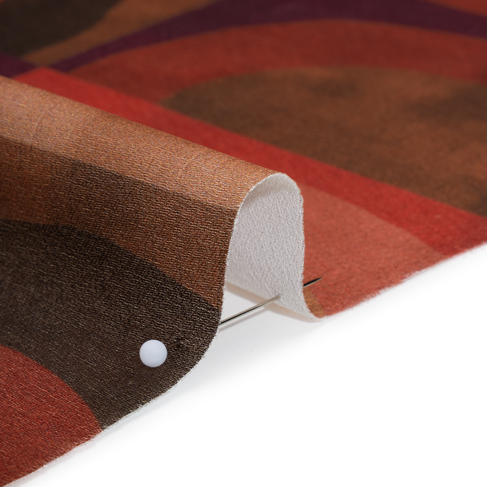 Our Mood Exclusive Adobe Abode Polyester Crepe-Back Satin inspires truly steamy styles—featuring a smooth hand, slight luster, and billowing drape.Suggested Projects: Shirts, Pants, Dresses, SkirtsContent: 100% PolyesterStretch: NoneOpacity: Slightly TranslucentWhether you’re lounging in the shade or stepping out into the sun, this print invites you to take a moment and ground yourself with the earth. A tiled design of rectangles adorned with half-circles in warm tones of brown, beige, olive green, coral, eggplant purple, and red creates a truly captivating motif. In stark contrast with the matte, grainy reverse, the face boasts a smooth hand and slight luster. To emphasize the full-bodied drape, create billowing summer gowns and maxi skirts with the satin side, or achieve a more casual style with patterned camp shirts and wide-legged pants. Slightly translucent, we recommend adding a lining for opacity and a luxurious finish.