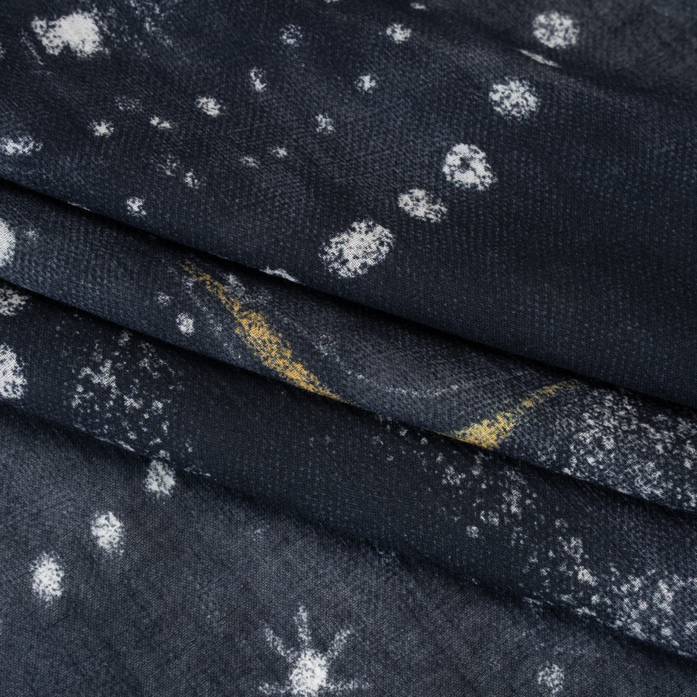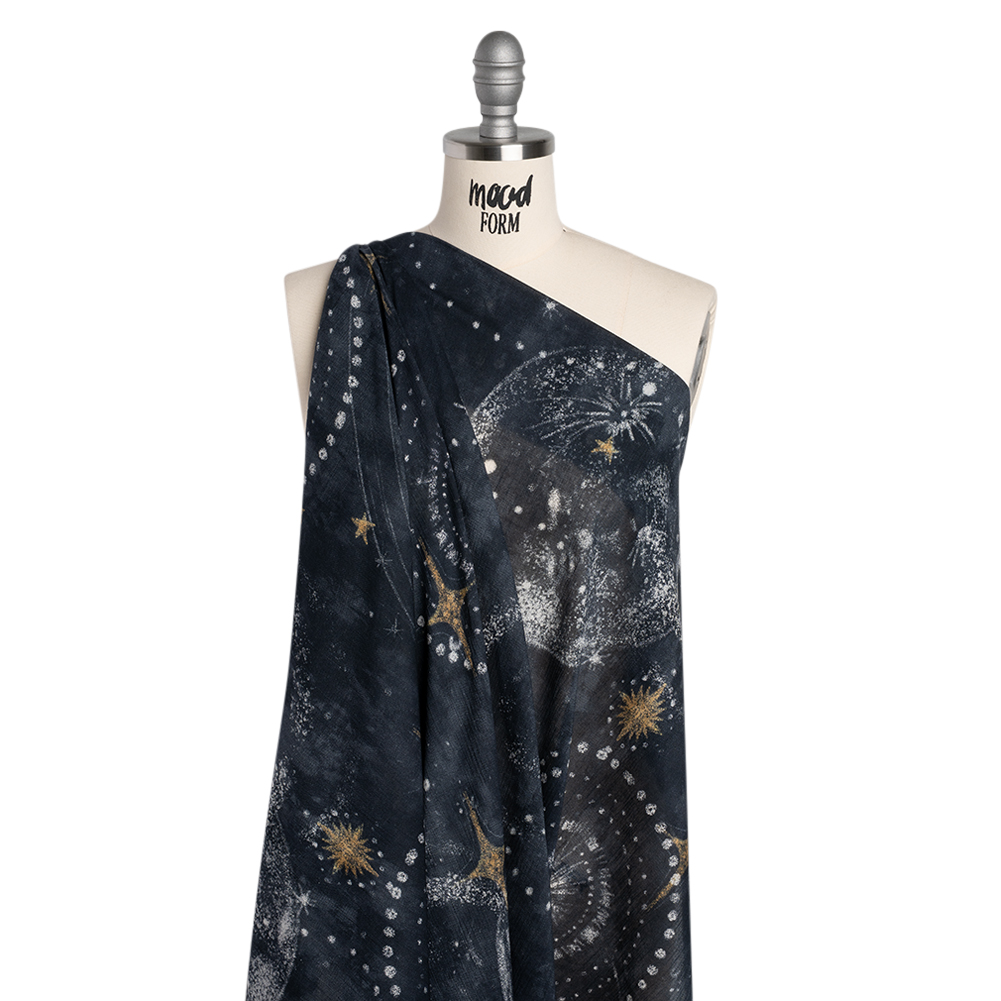 Explore new worlds with our Mood Exclusive Little Traveler Crinkled Cotton Gauzy Woven—featuring a slight stretch, dry hand, and airy drape.Suggested Projects: Blouses, Tops, Skirts, DressesContent: 100% CottonStretch: 15% WeftwiseOpacity: SheerLike the winding adventure of a certain young prince, the deep navy blue of this gauzy woven is adorned with whimsical chalk-like illustrations of moons, tiny planets, constellations, and shooting stars. It beckons to a childlike wonder of the cosmos, evoking a sense of adventure and curiosity as though gazing up at the night sky through the pages of a beloved storybook. Highly breathable and moisture absorbent, this fabric makes dressing for summer events a breeze—and any casual event, for that matter. Its dry, slightly grainy hand and airy drape encourage clean silhouettes and lightweight ensembles, from romantic maxi skirts and sundresses to flowing tank tops and breezy blouses. Plus, it's perfect for the beginner sewist—just remember to prewash it (as cotton is prone to shrinkage), pin it before cutting, and finish all edges to prevent fraying! As it is sheer, a lining may be necessary for certain applications.