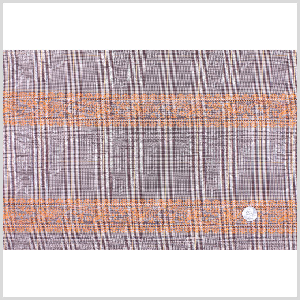 Check out this interesting Brown and Orange Plaid and Paisley Polyester Taffeta! Featuring a brown Glen plaid as the base, seak out the barely visible floral motif subtly woven atop alternating with striking orange stripes resembling chantilly lace trims running from selvage to selvage.