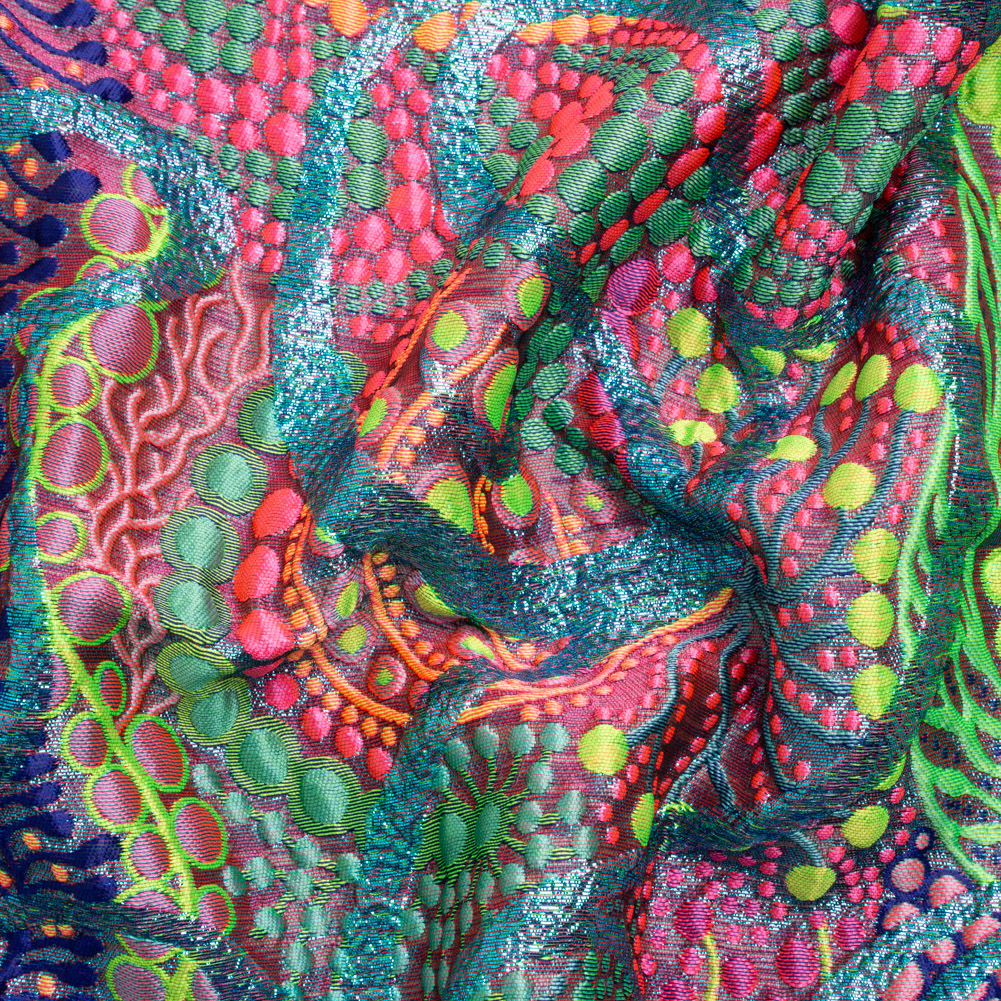 This Metallic Blue, Pink and Green Organic Flow Luxury Brocade is an extravagant explosion of life and color. Hot pink, neon green, and blue circles rise to the surface of a coral reef, rich with vivacious activity. Orange seaweed dances and navy anemones sway with the lustrous blue current swishing fluidly over the foreground. The embossed face brings a spongy, dimensional feeling to the hand as the metallic threading yields a slightly coarse texture. The malleable yet voluminous drape lends itself well to beautiful gowns, circle skirts, structured jackets, and sheath dresses. For added structure, comfort, and luxury, we suggest lining this fabric with our silk habotai.