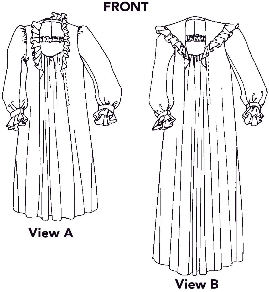 This sewing pattern has two views. View A has a ruffled neckline and is cut just below the knee. View B features a wide triangular ruffled collar and the traditional ankle-length.