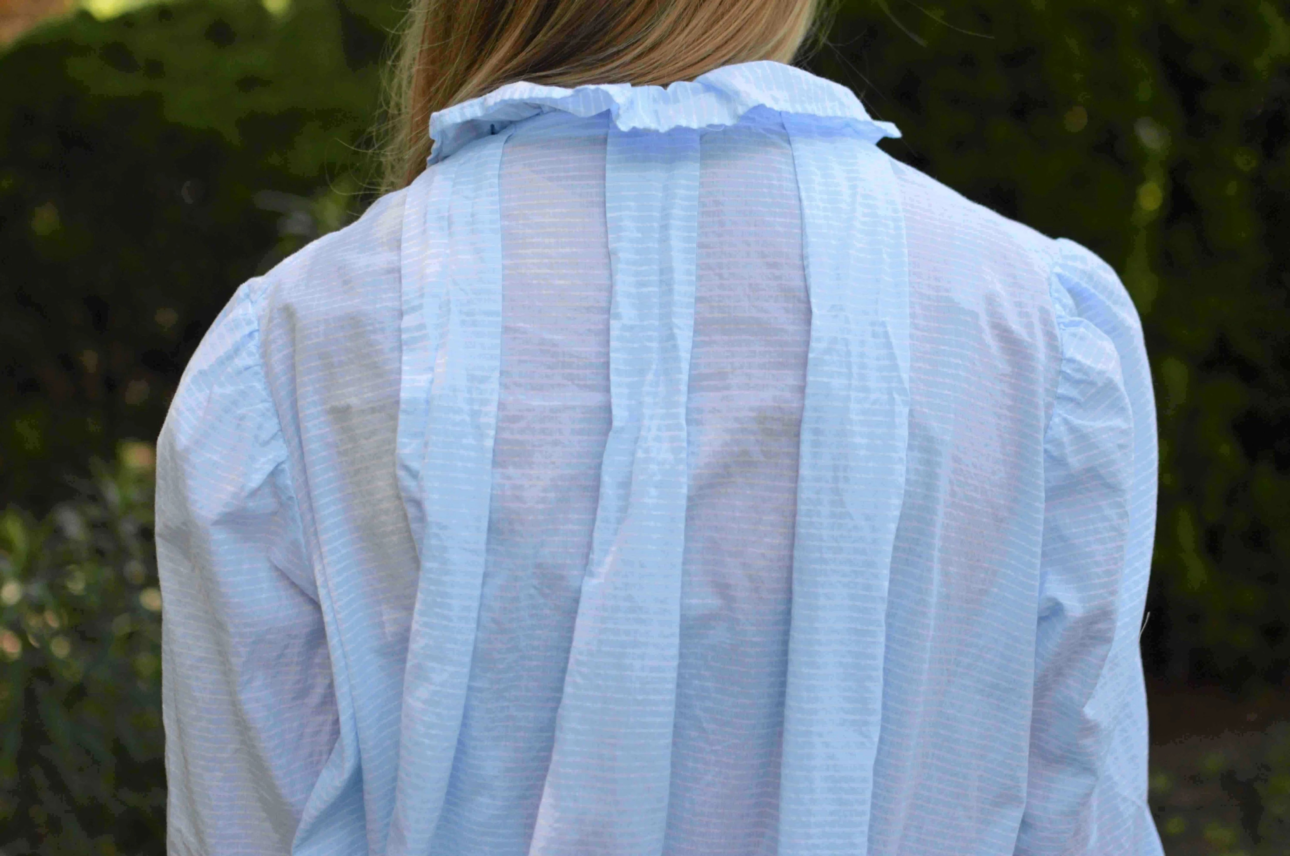 Both views are full and flowing, with three deep box pleats in back; fronts gather into a gently rounded, ruffled bodice yoke. Side seam godets add a slight flare. Both are closely fitted to the upper body with a deep buttoned opening at left front (which can also be omitted). Long puffed sleeves are finished with slip-over wristbands and ruffles that fall gracefully over the hands.