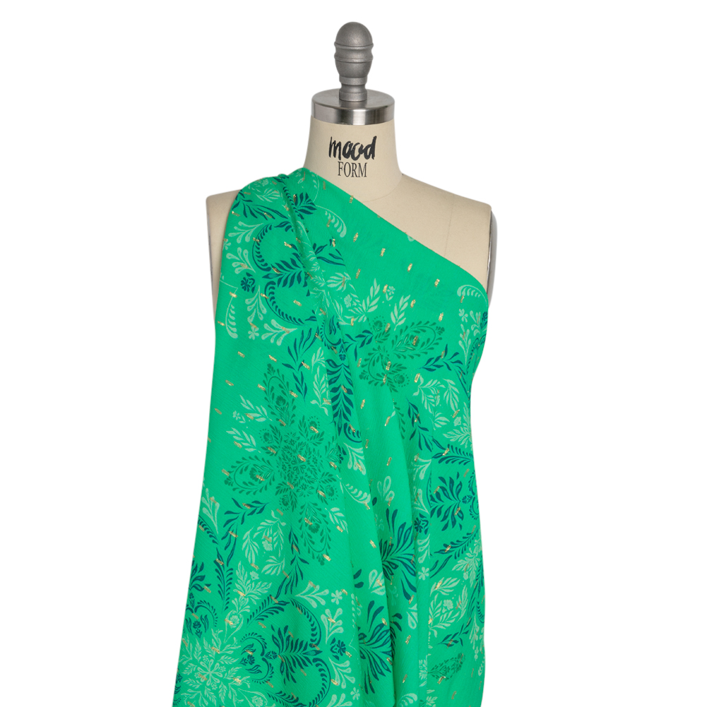 As the curtain rises on our Mood Exclusive Aqua Synchronized Snapdragon Metallic Dotted Crinkled Viscose Crepe, arrangements of petals and leaves dance across a sea-green stage. The crinkled face, decorated with rows of metallic gold dots, displays the most distinguishable characteristics of a crepe: a grainy and crisp hand. A rippling drape compliments semi-casual silhouettes as its cool, medium-weight feel is perfect for all climates; create airy skirts, a-line sundresses, workday blouses, and more! Slightly transparent—a lining may be desired.Here are a few tips from our sewists to master crepe’s unique texture:Lower the thread tension on your sewing machine to prevent puckeringUse a new, fine point needleTo prevent slipping during cutting, line up your pieces with the pattern pieces, cut in single layers, and use a rotary cutter or tabletop scissorsBe patient and have fun!