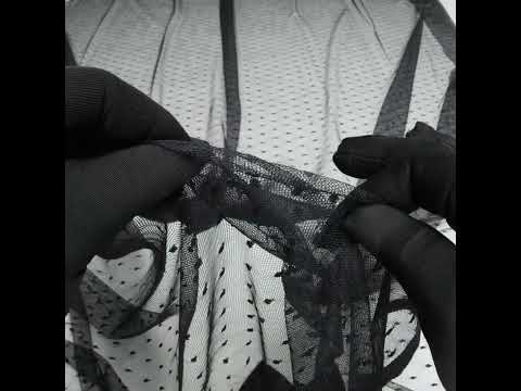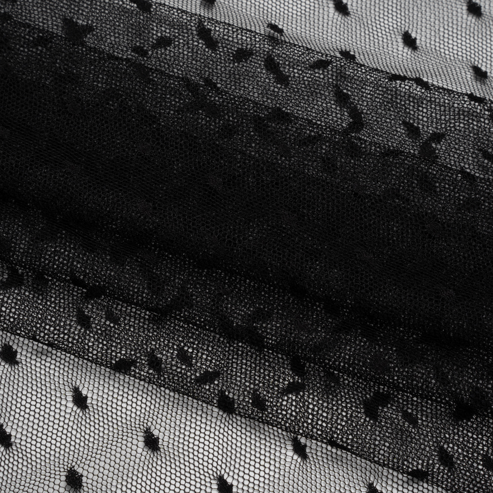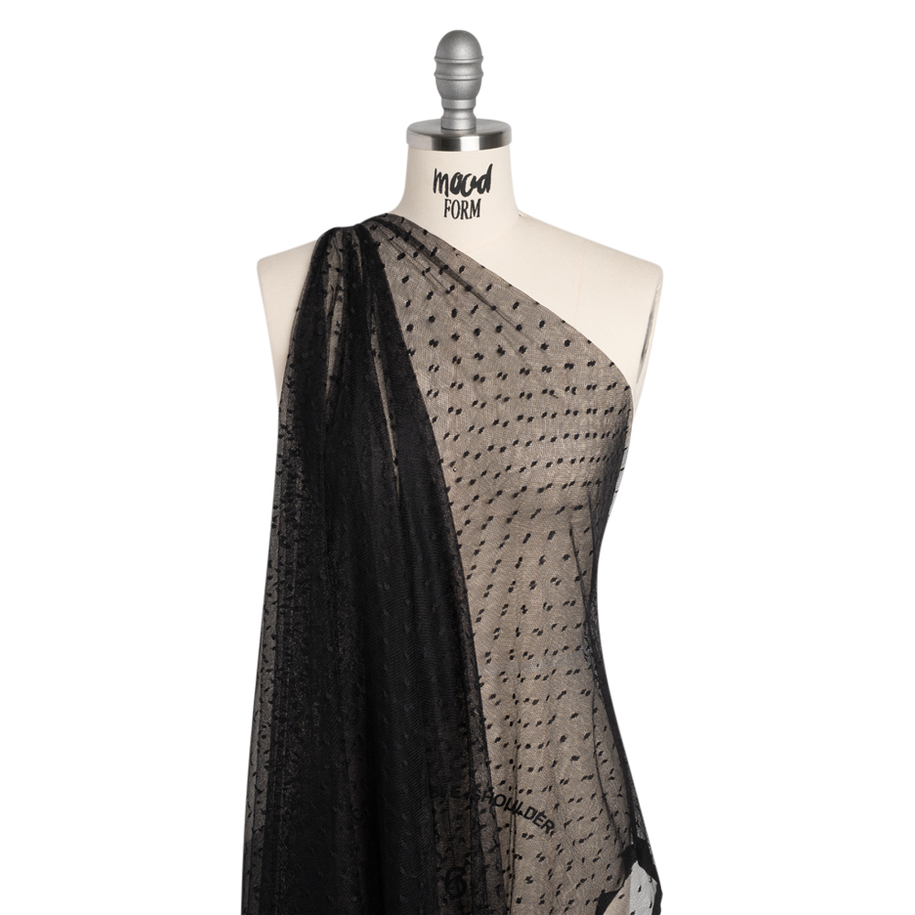 The point of this Black Polka Dots Nylon Raschel Point D’Esprit Lace is to easily imbue your designs with elegance—featuring a soft, tactile hand and malleable drape.Suggested Projects: Lingerie, Dresses, Skirts, AccessoriesContent: 100% NylonStretch: Weftwise Mechanical GiveOpacity: SheerThis delicate black lace features tiny woven dots scattered across its sheer surface, forming a classic and elegant point d’esprit pattern. With a soft, tactile hand, malleable drape, and slight mechanical give through the weft, it lends itself beautifully to both flowing silhouettes and subtly contoured designs. Ideal for romantic lingerie, graceful overlays for gowns, skirts, and jackets, or as a refined touch in accessories like tights and gloves. Due to its sheer nature, layering or adding a lining is recommended for additional coverage.