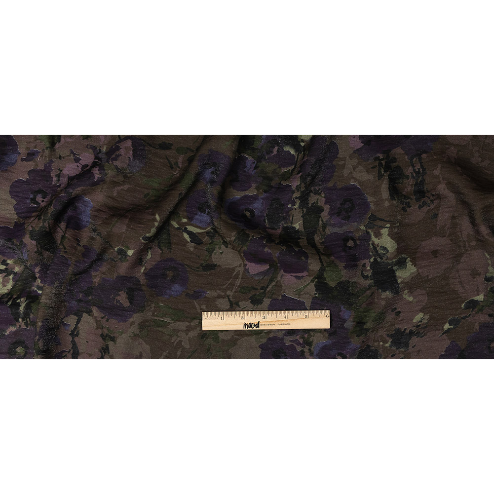 Nighttime blooms never looked so good as this Italian Shimmering Purple and Gray Floral Vegan Crinkled Woven! A crinkled gray-brown ground with a lovely sheen plays host to a purple and green floral print and a silky, textural hand.