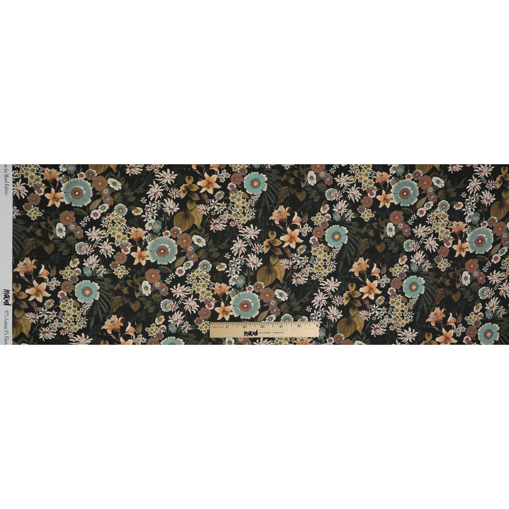 Take home our botanical beauty, the Rustic Narcissus' Reflection Stretch Cotton Sateen! This refined fabric, boasting a subtle sheen, will impart a touch of elegance to dresses, jackets, trousers, or tops.Suggested Projects: Pants, Skirts, Unconventional Suitings, DressesContent: 97% Cotton, 3% ElastaneStretch: 10% WeftwiseOpacity: TranslucentFrom our Gaia Collection, named "Narcissus' Reflection", the smooth sateen symbolizes the mystery of beauty's reflection which enticed the Greek god Narcissus. Rich hues sit upon a dark backdrop as they create an abundance of flowers over the luxurious woven. Use its flexible drape to create everything from tapered pants to sheath dresses. A stretch through the weft gives your piece a sleek fitted look. Thin and lightweight, it is translucent and may require a lining.