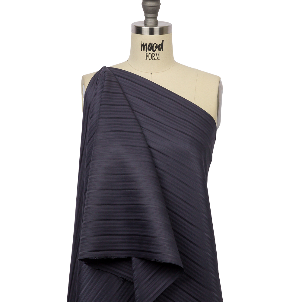 This sophisticated Dusty Purple Striped Silk and Polyester Dobby will have you doing a double take. Deep, dark, dusty purple tints a striped design throughout this lustrous, lightweight, fabric. Enjoy a cool, slightly textured hand and a malleable drape as you modestly introduce variety in pattern and color to your wardrobe. Craft collared shirts, ties, and other formal wear with ease. Opaque, a lining may be useful for an added professional look.