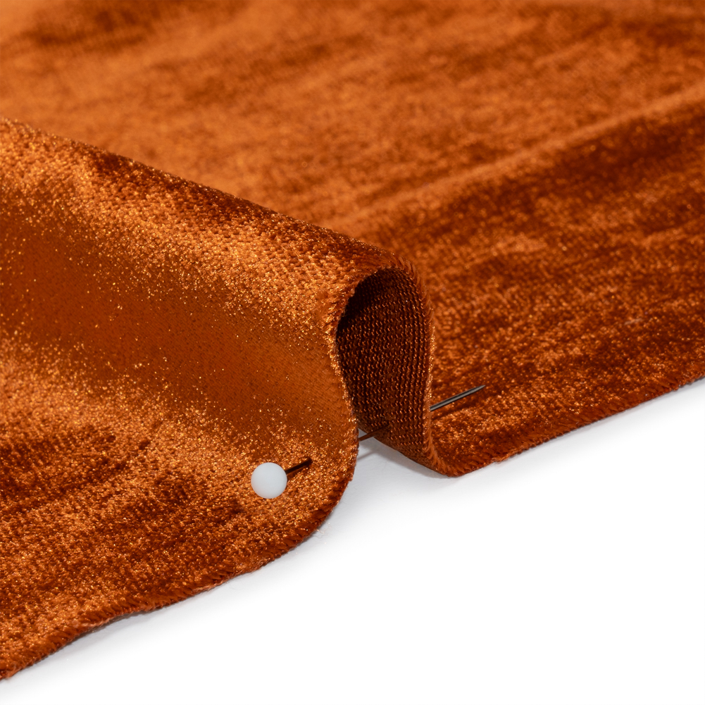Spice up your life with the warmth of this Ainslie Spice Textured Upholstery Velvet. The dark orange face yields more than just the signature texture of velvet—very discreet striations hide behind the blinding luster, offering a subtle dimension to the soft and sleek hand. It features a medium-weight feel, a malleable drape, and a slubbed woven on its reverse. With a luxury that has captivated ancient royals to modern designers, this mature textile effortlessly elevates your formal living room ottoman, your tufted headboard, your piano bench cushion, and more.Here are some sewing tips from our professional velvet experts: Before cutting and stitching your velvet, decide which way your pile is facing and stick with it.Test on a scrap piece first—you may want to adjust presser foot tension and use a longer stitchCutting on the wrong (reverse) side will ensure accurate markings.Velvet is slick: cutting in one layer (with a rotary cutter!) and using a walking foot will prevent slipping; hand basting your seam lines will prevent creeping.