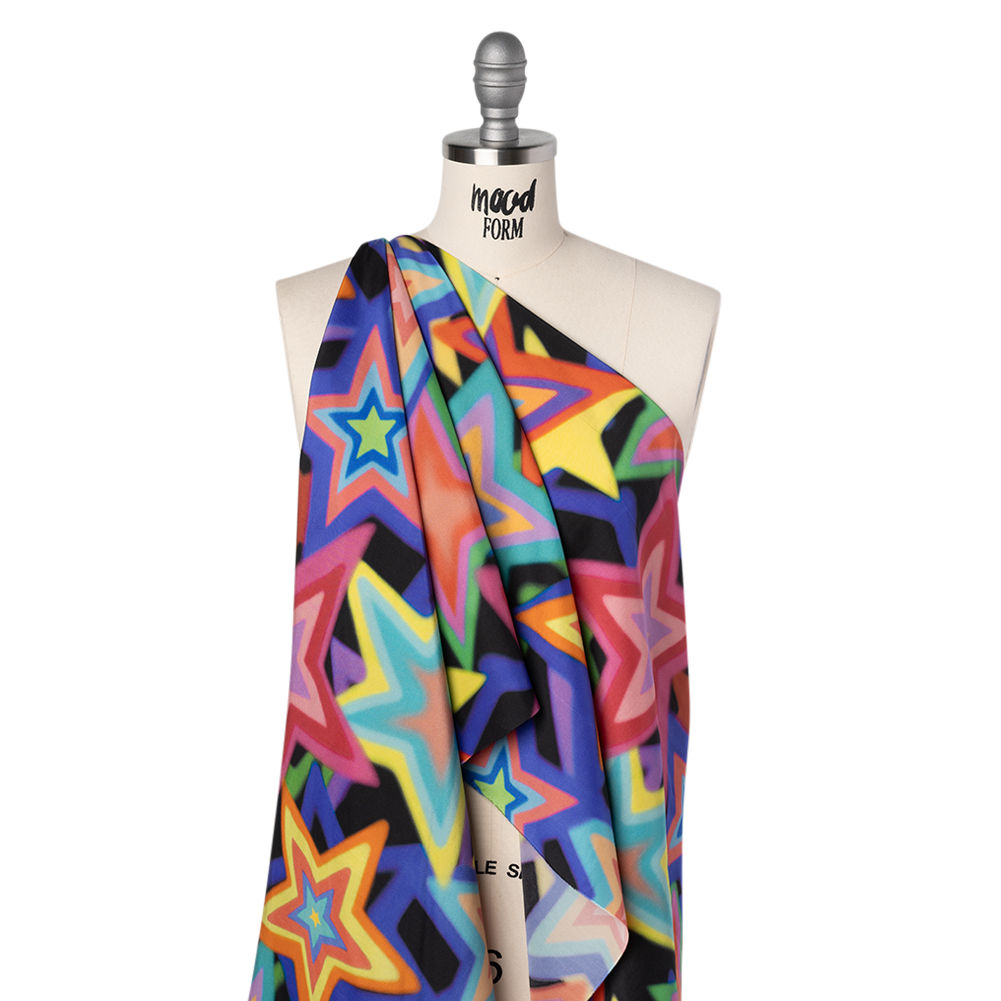 Your style will align with the stars in this Rainbow Stars on Black Lightweight Silk Poplin Print, where bold bursts of color radiate with cosmic charm—unfurling in a smooth hand and airy drape.