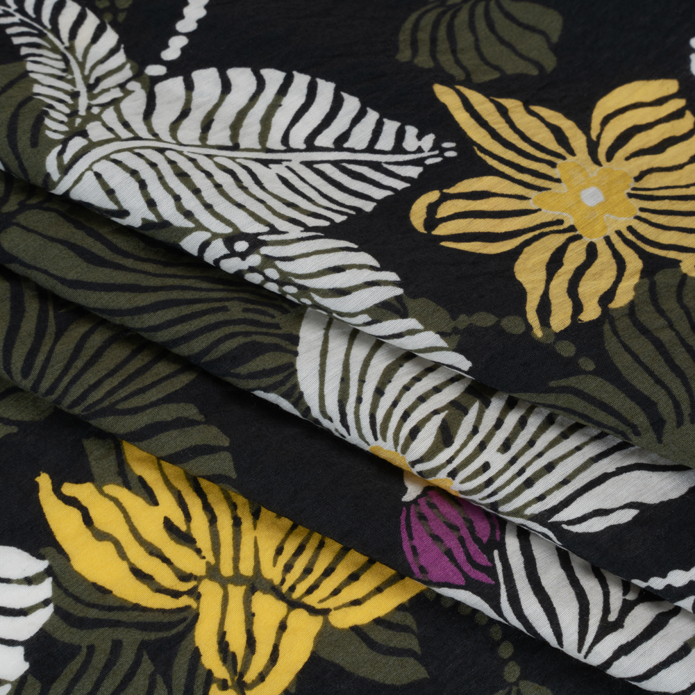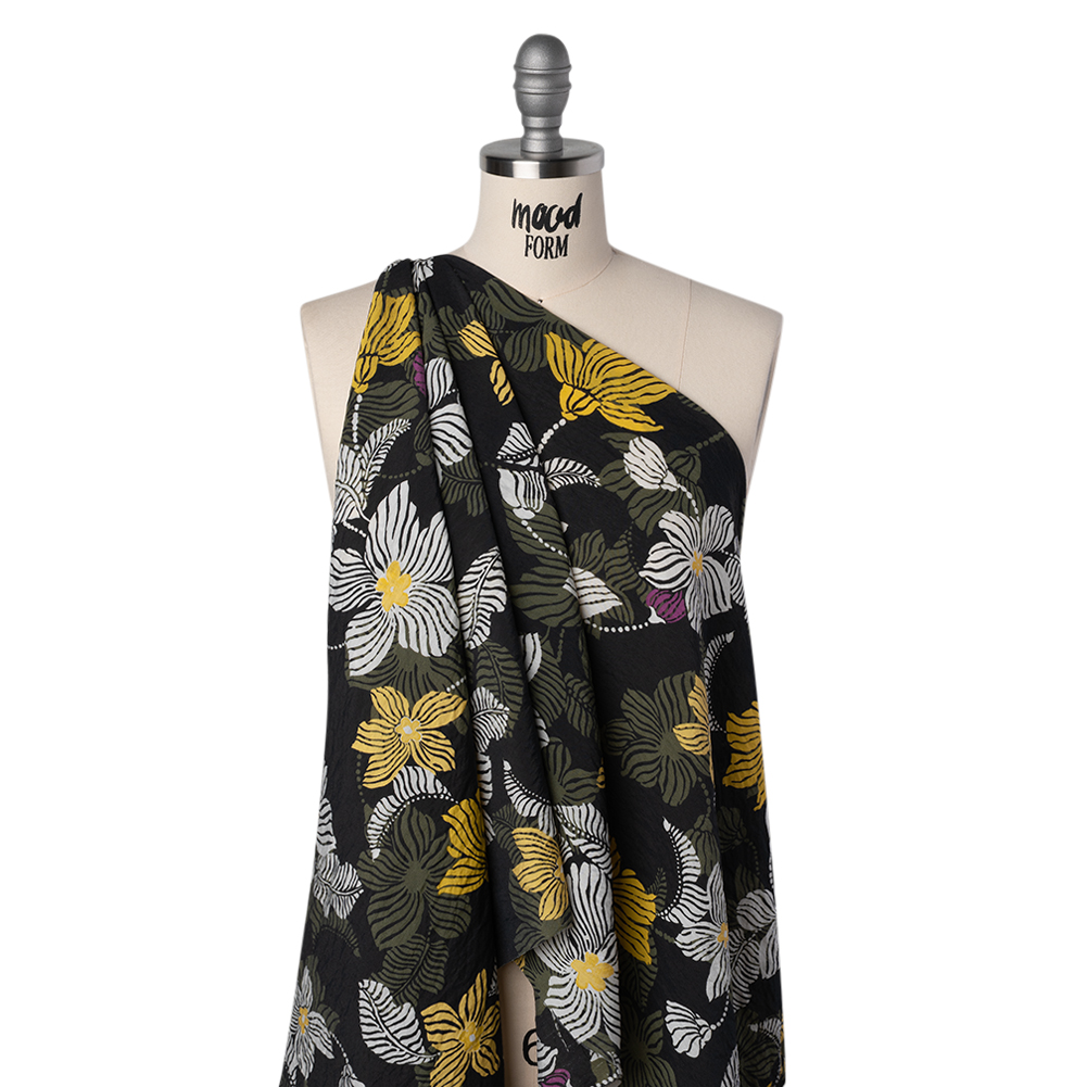 A garden party in motion, this Olive, Yellow and Purple Floral Crinkled Viscose and Nylon Woven brings texture and charm to every flowing silhouette.Suggested Projects: Shirts, Skirts, Dresses, PantsContent: 80% Viscose, 20% NylonStretch: NoneOpacity: Slightly TranslucentFeaturing a layered floral print in muted earth tones and a popping purple, this lightweight woven has a naturally crinkled texture that adds dimension and visual intrigue without extra bulk. It drapes with a gentle ease and has a cool, dry hand—ideal for relaxed shirting, gathered skirts, wide-leg pants, or easygoing dresses with a hint of flair. Depending on the style, a lining may help enhance modesty or structure.