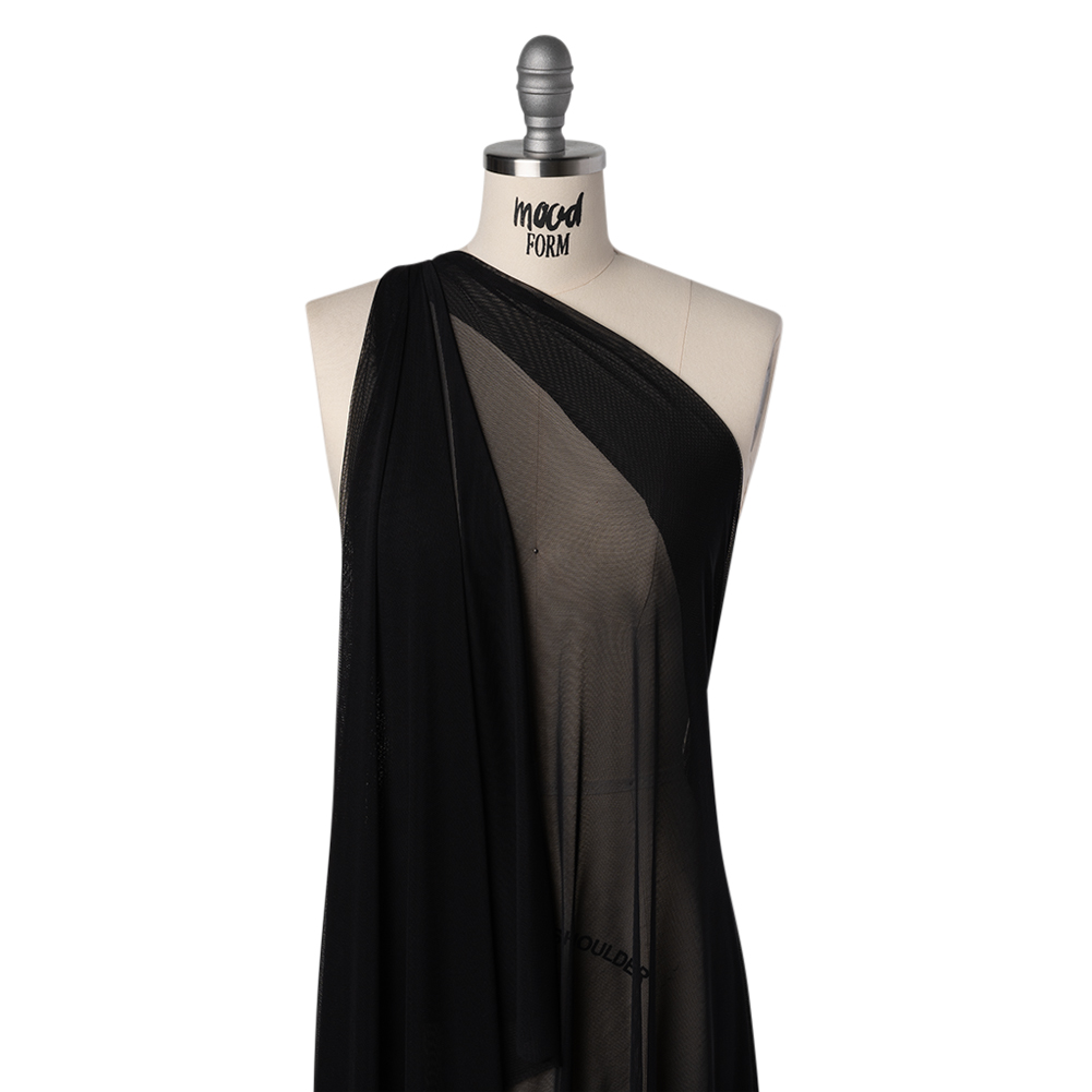 Grab this Black Nylon Stretch Mesh out of the shadow and into the spotlight—featuring a soft, smooth hand and malleable drape.