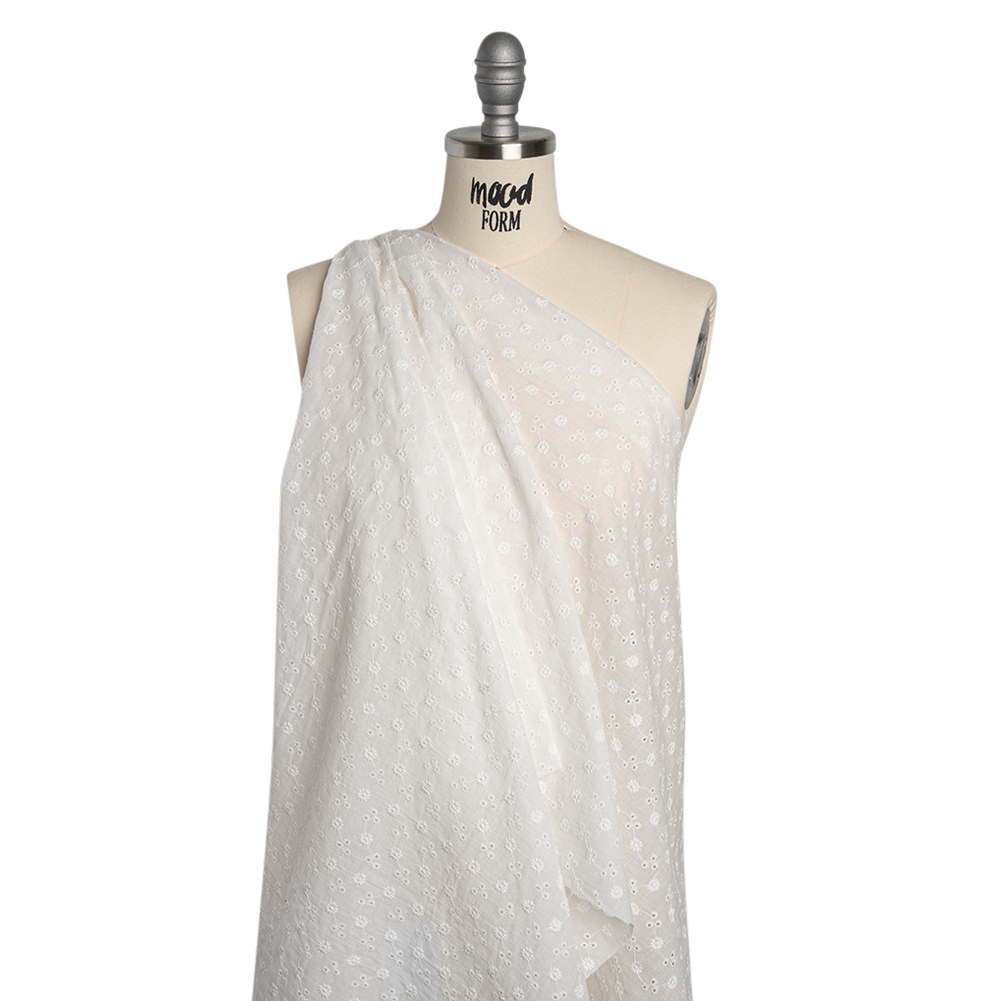 This White Little Flowers on Vines Embroidered Eyelet Cotton Voile will billow in the gentle spring breeze—featuring a dry, tactile hand and crisp, airy drape.Suggested Projects: Shirts, Skirts, Dresses, ShortsContent: 100% CottonStretch: NoneOpacity: TranslucentLittle flowers bloom and blossom along their thin vines that crawl across this white cotton voile. Derived from the French word for veil, voile has a history of gracing romantic occasions with its ethereal sheerness and airy drape. With a dry, tactile hand and crisp yet airy drape, it easily navigates the space between elegance and simplicity. Made from 100% cotton, this naturally breathable fabric is the perfect choice for breezy spring and summer garments—its eyelets further helping you stay cool under the sun. Use it to craft summer dresses, flowing blouses, skirts, tiered maxi skirts, and more! Translucent, a lining may be desired.