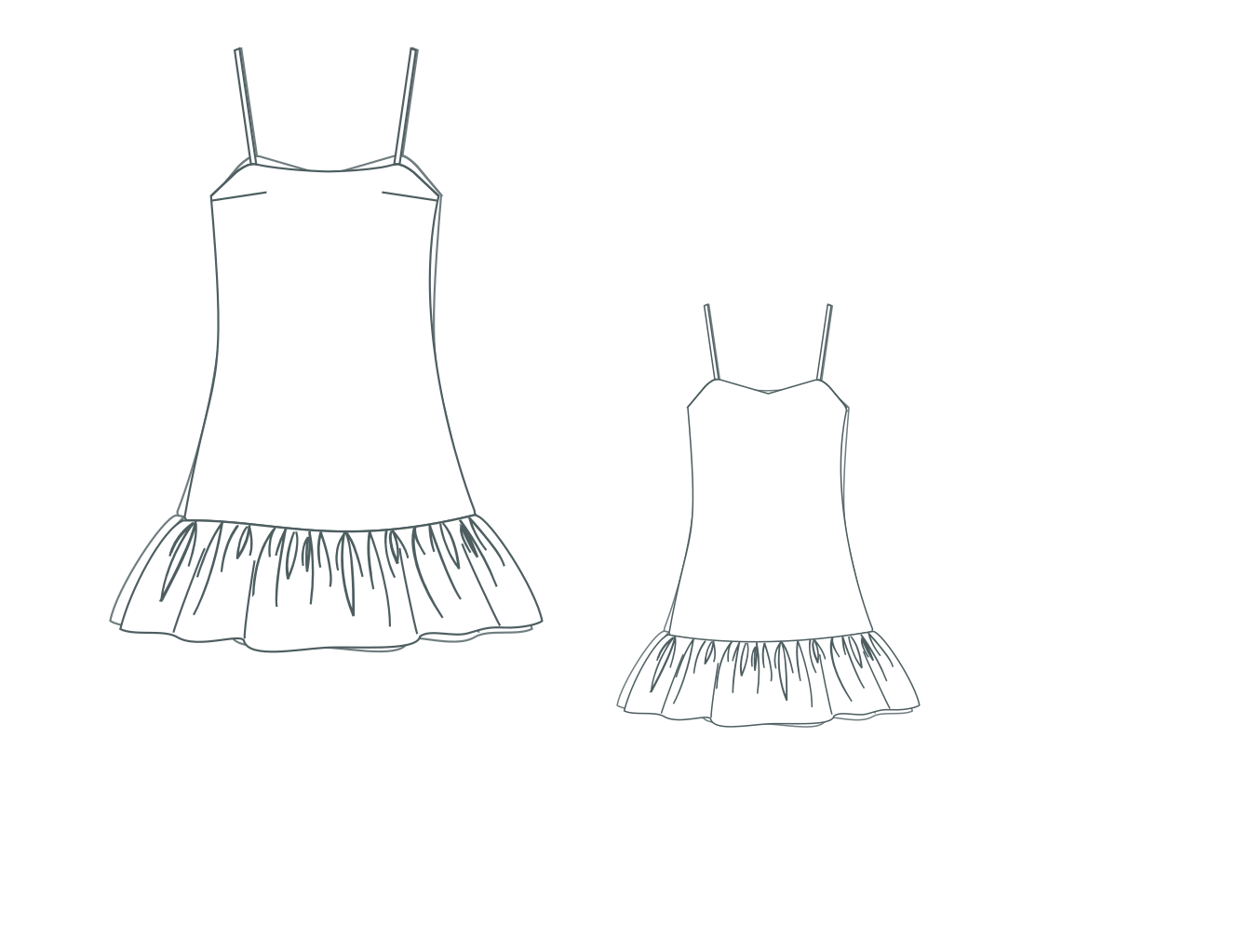 Woven, micro mini trapeze dress with bust darts, sarafan styling, straight neck, ruffle hem, sleeveless.