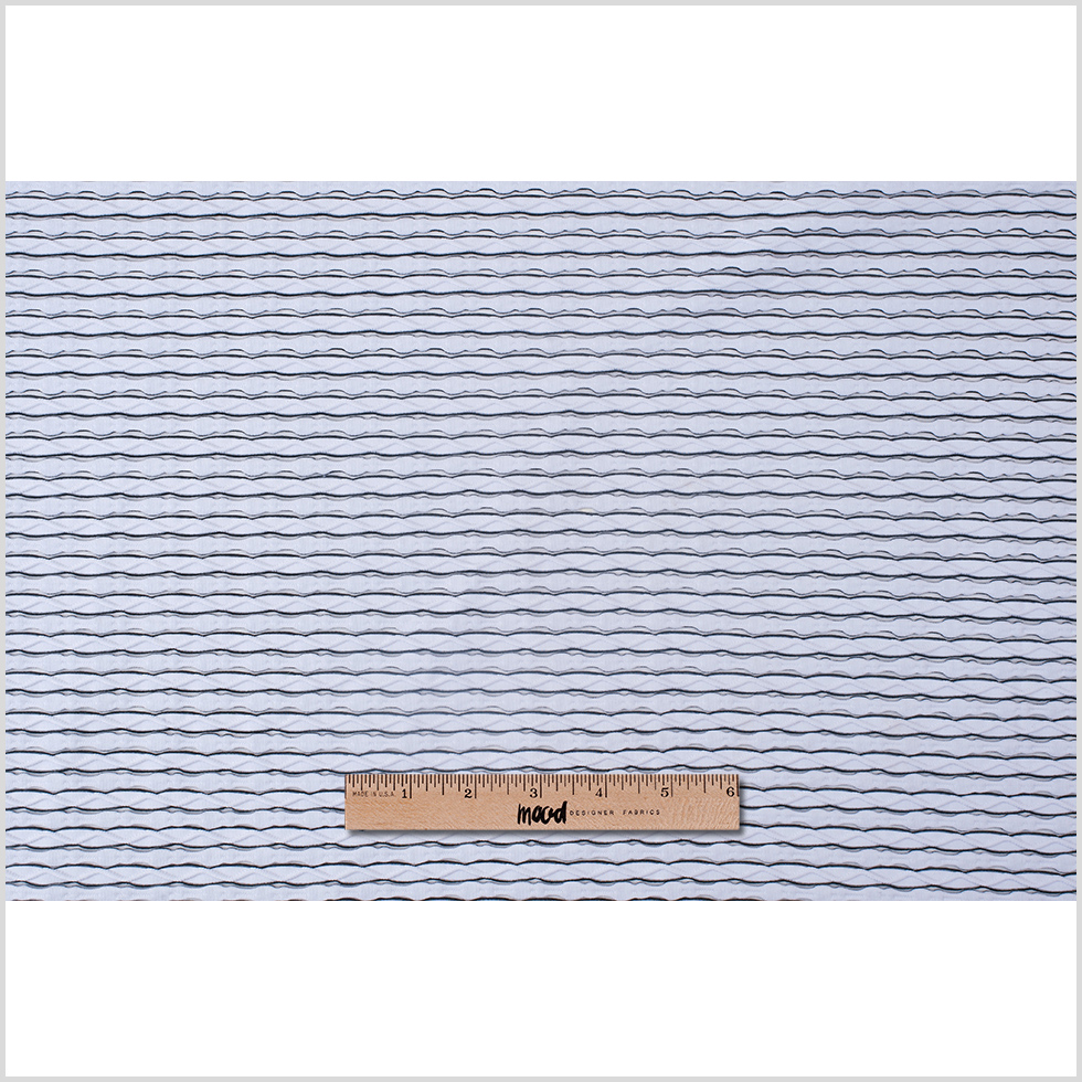 Mood presents this polyester blended jersey which features black and white stripes atop a crimped material.