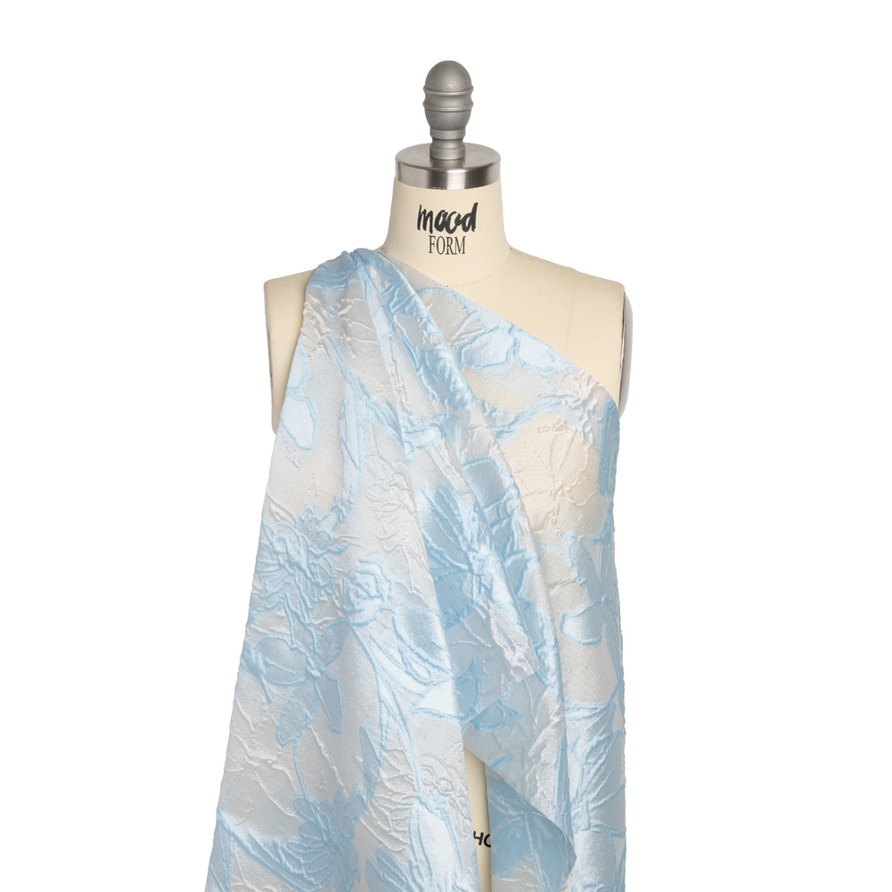 The sheer elegance of this Baby Blue and Cream Floral Sheer Luxury Brocade will blow you away! Light blue flowers grow with a little more opacity than their cream counterparts. The brocade weave raises the outlines of these flowers, creating the look of an embossed surface and bringing dimension to the mesh-like hand. Lightweight, lustrous, and semi-structured, create overlays of gowns or pair with a silk habotai lining for optimal luxury!