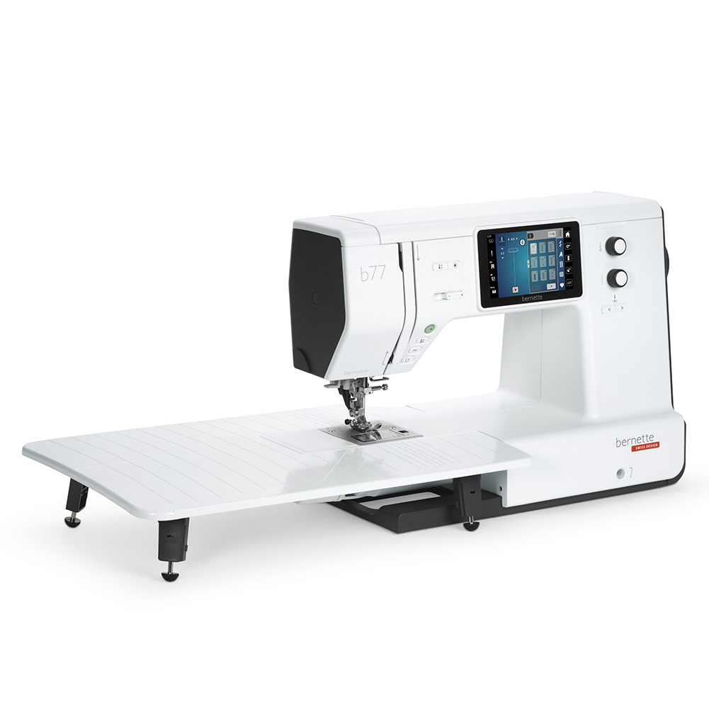 With a focus on sewing and quilting, the bernette 77 Computerized Sewing Machine is the perfect companion for the cozy creator. Offering 500 stitches, both automatic and manual thread cutters, a built-in threader, and a 5-inch color touchscreen for easy navigation, it makes every project effortless. Its versatile construction handles everything from delicate chiffons to sturdy leather, while multi-function knobs allow quick, precise adjustments so you can focus on your next masterpiece. A creative sewing consultant guide is included to provide expert tips and inspiration. Notable features include: 22 Practical Stitches 500 Sewing Stitches Freearm 9” workspace to the right of the needle Maximum sewing speed: 1,000 stitches per minute Stitch Width: 7mm Drop-In Hook System Start/Stop Button (stitching without foot control) Needle Stop Up/Down Adjustable Presser Foot Pressure Bernette Dual Feed Programmable Securing FunctionThis set comes complete with three bobbins, a spool net, a selection of needles, a brush/seam ripper, a large, medium, and small spool disc, a dust cover, slide-on table, felt disc, second spool pin, seam guide, lubricator, power cable, screwdriver, foot control, and Free Hand System—everything you need to bring your creations to life.