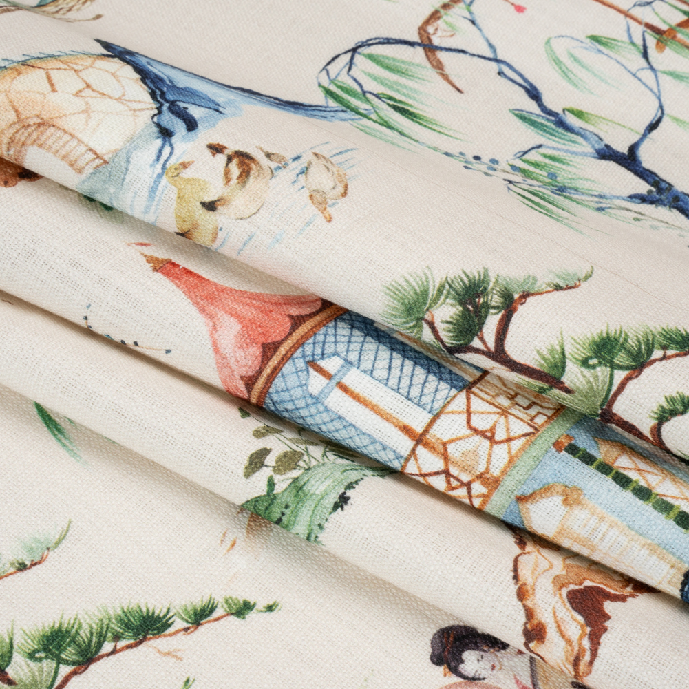 A solitary harpist finds her muse in the tranquil landscape of this Blue, Green and Flax Japanese Gardens Slubbed Cotton Woven. Breathing a collective sigh of peace, gulls, ducks, pagodas, and weeping trees create a quiet life between her music in watercolor hues. The 100% cotton fabric is softly slubbed with an easy drape—perfect for following the edges and curves of your furniture. Reupholster loveseats that start a conversation or sew sofa cushions for the wicker furniture in your sunroom. Don’t be afraid to bring this fabric to your window treatments as long curtains or unique valances, too! A lining may be desired to achieve complete opacity.