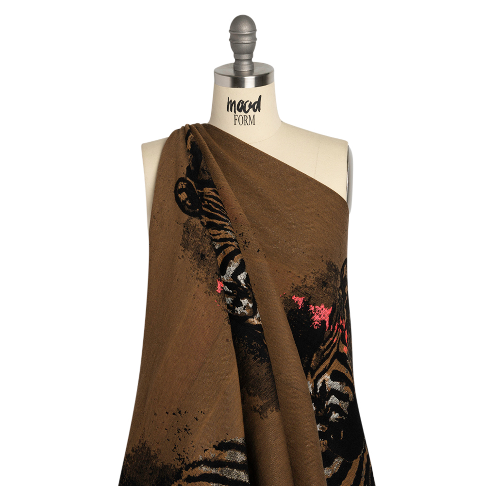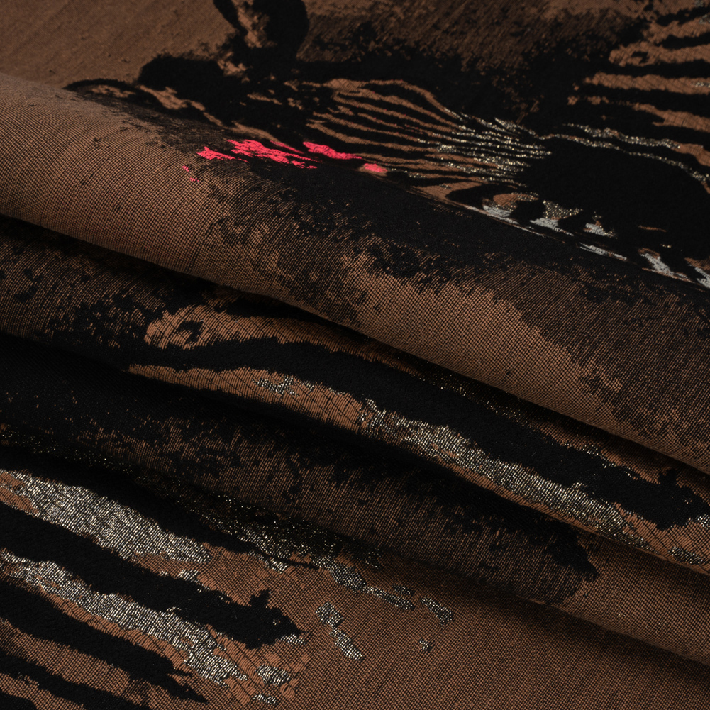 Live creatively with this Brown, Black and Hot Pink Zebras Metallic Brocade Panel! Zebras emerge from a brown and black fabric, featuring an easy drape and 10% warp-wise stretch. Reminiscent of street art, the pink, black, and metallic paint splotches bring an urban twist to a savanna scene, calling on you to create spunky runway-ready looks! Fashion structured jackets, long skirts, and more! Brocades are a heavy, detail-oriented fabric that inspire home sewists and fashion designers alike with their complex designs and three-dimensional elegance. On this brocade, a swipe of your hand identifies the plush zebra stripes, grainy metallic thread, and sleek background. These textures bring this fabric to life—all it now needs is you. Completely opaque, a lining will add comfort and structure if desired. Please note this panel measures 62" wide and 25" long.