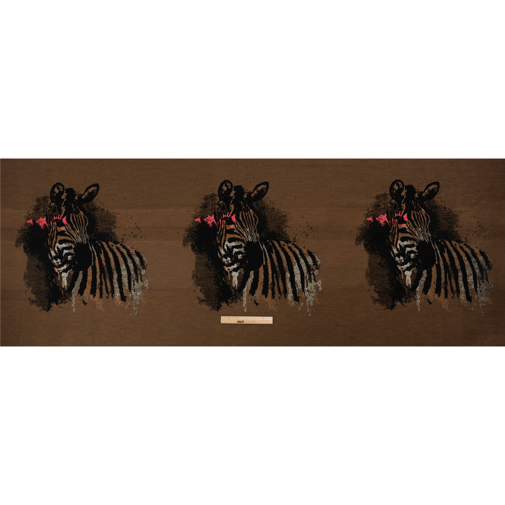 Live creatively with this Brown, Black and Hot Pink Zebras Metallic Brocade Panel! Zebras emerge from a brown and black fabric, featuring an easy drape and 10% warp-wise stretch.