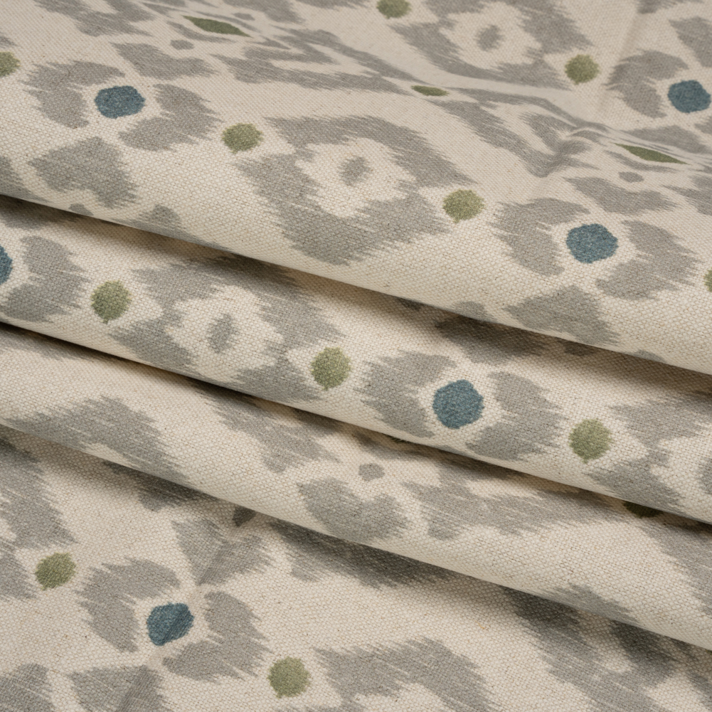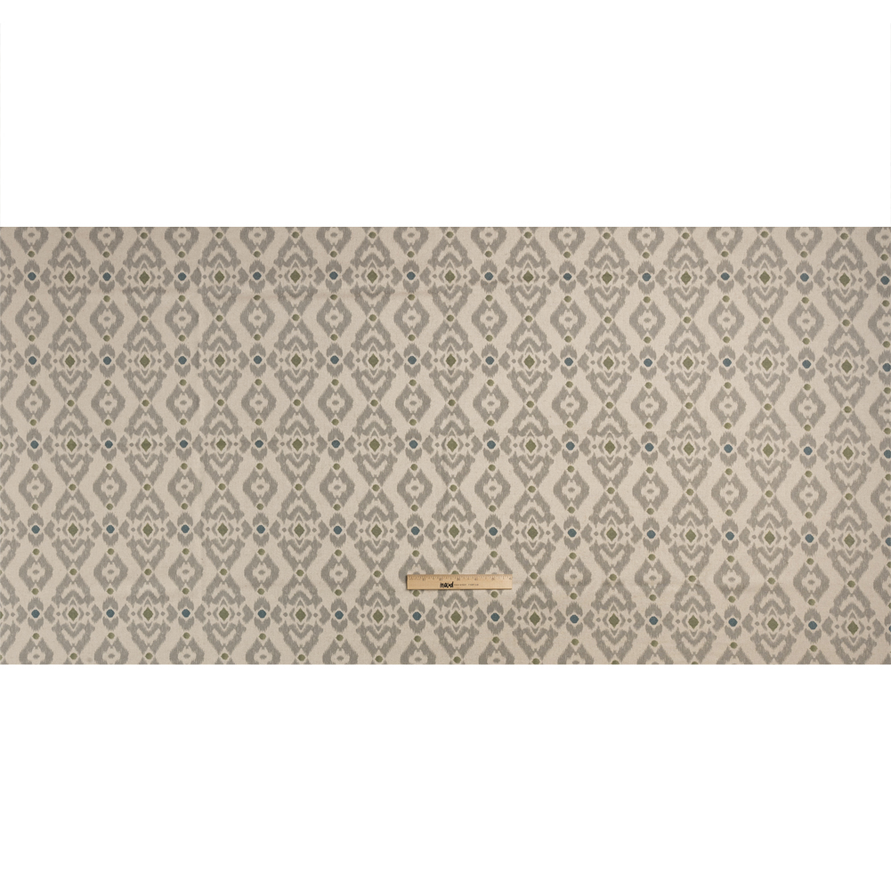 Reimagine your home with this British Imported Olive Ikat Geometries Printed Cotton and Linen Canvas! Printed canvas fabrics sway between rustic and refined, offering themselves like a piece of art to living rooms, kitchens, bedrooms, and even wardrobes—while ideal for curtains and light upholstery (like headboards and ottomans), canvas is also great for structured jackets and tote bags!This beige canvas displays a gray diamond pattern punctuated by navy and green diamonds and circles; its pebbly texture and semi-structured drape are attributed to the linen and cotton blend. While mostly opaque, a lining will add more opacity and structure.