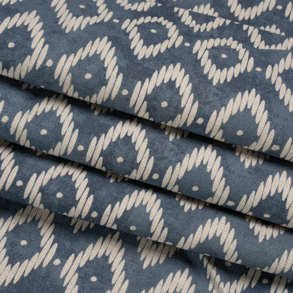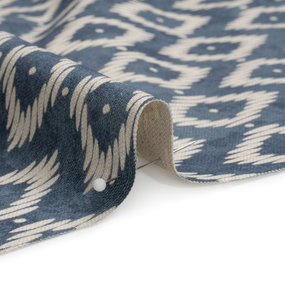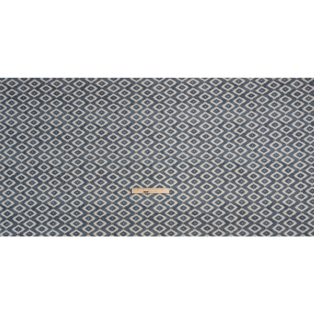 Curtail your creative yearnings with this British Imported Steel Diamonds and Dots Printed Cotton and Linen Canvas! A blue background, hazy with light and dark shades, hosts repeated columns of diamonds and dots. The pebbly hand, semi-structured drape, and slight transparency create a durable work of art for understated drapery and light upholstery projects.The natural texture of canvas fabrics is rustic in appearance, curating ease and refinement in your home. This simple pattern charms kitchens with valances and inspires throw pillows and headboards—plus, in admiration of its stability, wardrobes can be refreshed with structured jackets and tote bags.